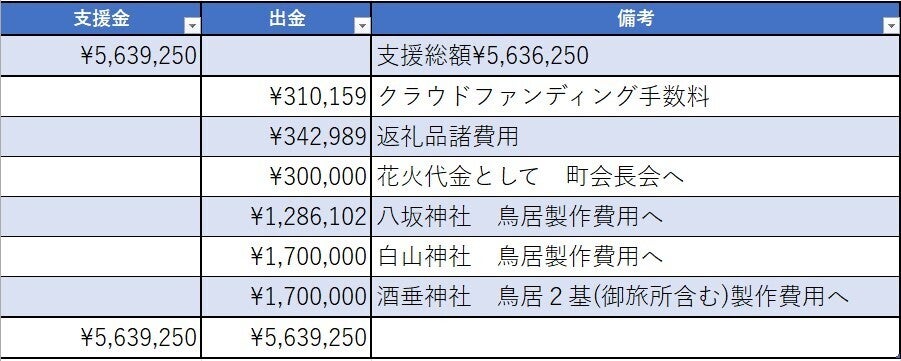 酒垂神社の2つの鳥居については、酒垂神社様自体が独自でのクラウドファンデングを実施されていた事などもあり白山神社様と同額でよろしいとの申し出により同額となりました。