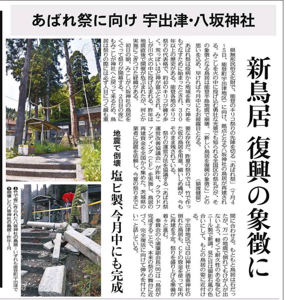 昨年実施いたしましたクラウドファンディング「能登半島地震で鳥居が全壊。神社の鳥居を復活させて、祭りの誇りと絆を取り戻したい。」につきまして、382名の皆様より総額5,639,250円のご支援を賜りました。心より御礼申し上げます。