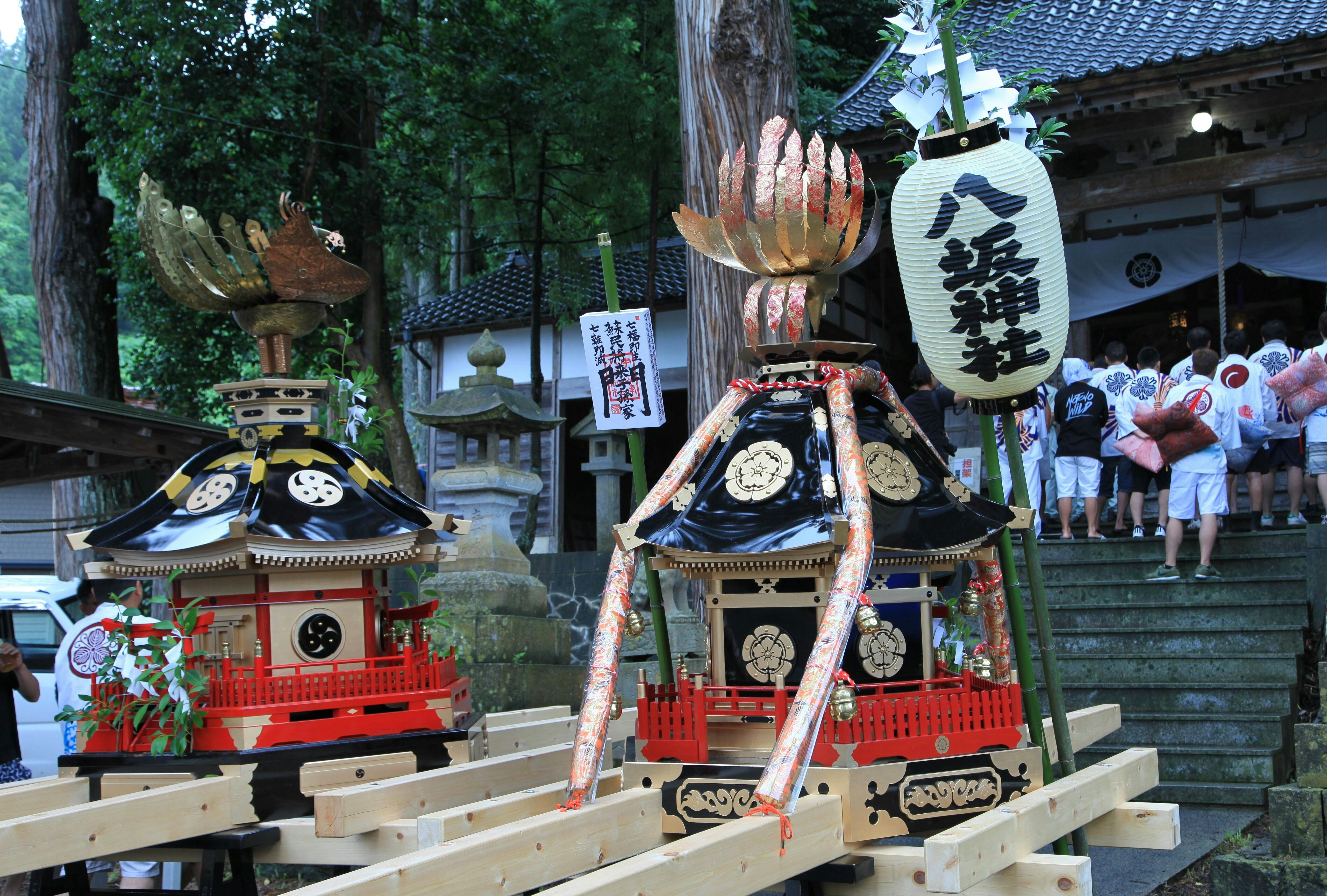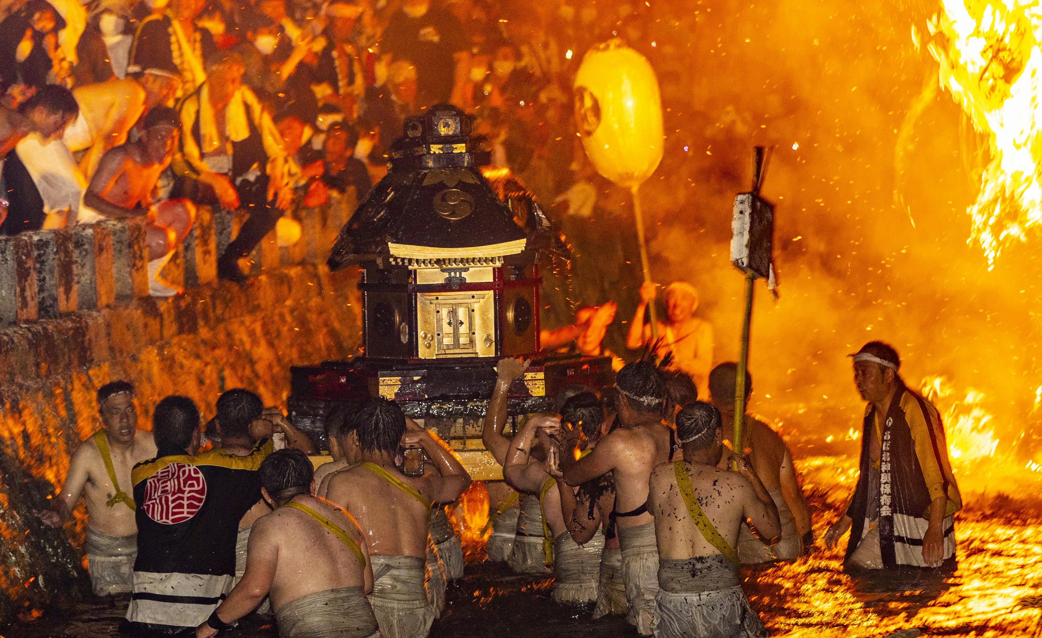 2日目には、キリコに伴われた2基の神輿が「入り宮」のため八坂神社に戻る途中、川や海、松明の火の中へ投げ込まれたり、地面に叩きつけられるなど、激しく暴れます。そして、再び鳥居をくぐり境内に入ることで、祭りは終了となります。