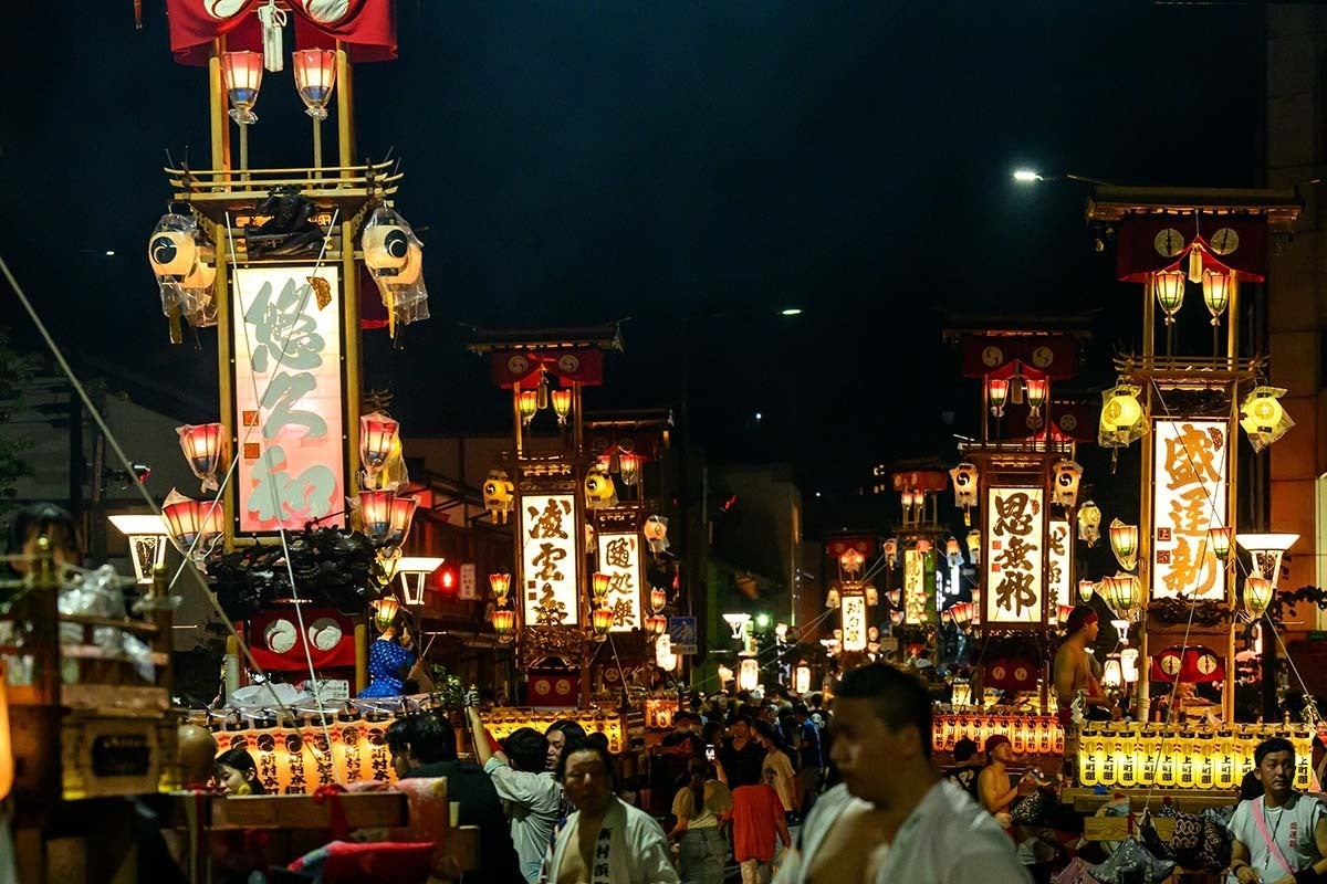 1日目の夜は、いやさか広場の大松明にキリコが集結します