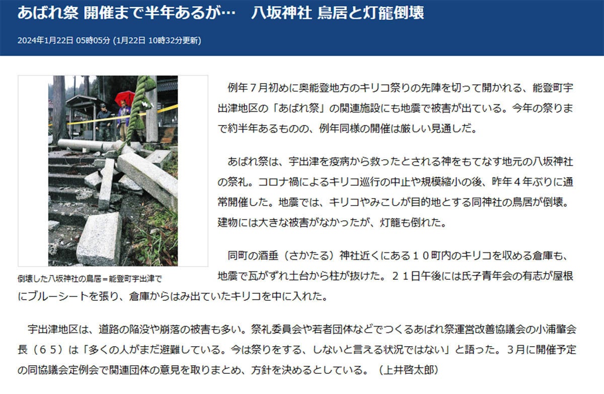 2025/10/29 13:18令和6年元旦に発災した「令和6年能登半島地震」から1年10ヶ月が過ぎました。皆様からのご支援のおかげでようやく4つの鳥居の再建が完了しました。本当にありがとうございました。八坂神社の鳥居 (その1)令和2年7月コロナ過において御神事だけ行われた際の八坂神社令和6年1月能登半島地震で崩壊した八坂神社の鳥居令和7年6月吉日完成した八坂神社の鳥居完成時の「北陸中日新聞」の記事令和7年7月早朝 例祭の御神事と出発を待つあばれ神輿白山神社の鳥居 (その2)発災時の白山神社鳥居完成した白山神社の鳥居御旅所の鳥居 (その3)発災直後の御旅所の鳥居令和7年9月に完成した御旅所の鳥居北國新聞社の朝刊記事酒垂神社の鳥居 (その4)発災直後の酒垂神社の鳥居令和7年10月 最後に完成した酒垂神社の鳥居皆様のおかげで、私たちが目指してきた「『あばれ祭』にとって重要な4つの鳥居を復活させ、祭りの誇りと絆を取り戻したい」というプロジェクトを、ようやく達成することができました。当初、御影石製での再建を検討していた際には、1基あたり1,000万円が必要とのことで、4基で4,000万円の費用がかかる計算でした。そのため、鳥居の再建がいつになるのか、またその負担を被災者である地域の人々に求めることが果たして可能なのかと、多くの議論を重ねてきました。そんな中、昨年の「令和6年能登半島地震」において、発災のタイミングが元旦の日であったにも関わらず、神社内で被害を受けた方はいらっしゃいませんでした。神社は人々の安寧を祈る場所であり、あってはならないことではありますが、万が一の災害に備え、やはり安全な施設でなければならないと感じました。そこで、「素材にはこだわらず」「費用も地域住民に負担をかけない形で」との思いから、塩化ビニール製の鳥居を選択しました。今回の製作は(有)中島ビニール加工様(茨城県日立市)にご縁があり製作していただきました。特別支援価格で4基の鳥居を請け負っていただき、茨城県から何度も通って製作して頂いた事に心より感謝いたします。そして何より、皆様からのクラウドファンディングへのご支援が、地域の人々にとって大きな励みとなりました。本当にありがとうございました。最後に地震からまもなく2年が経とうとしています。「復旧」「復興」という言葉が使われる中で、ライフラインの復旧はほぼ完了し、現在は「復興段階」に入っているのだろうと思います。ですが、現状をお伝えすると、半壊以上の建物については公費による解体が進んでおり、その締め切りが10月末日となります。町全体では急ピッチで解体作業が進みました。解体が進んだ梶川沿いの川原町の町並みは、次のようになっています。この場所は、例年「あばれ神輿」が梶川橋の欄干から川に投げ込まれる見どころでもあります。令和6年6月の梶川沿いの町並み令和7年10月29日の梶川沿いの公費解体がすすんだ町並み12軒が並んでいた川沿いの町並みが、今では2軒だけとなってしまいました。この後、この川沿いに何軒の家が再建されるのでしょうか。宇出津の町も徐々に寂しくなっていきます。これからも復興へ向けて全力を尽くしていく所存ですが、まだまだ支援が必要であることをご理解いただけますと幸いです。これまでのご支援、誠にありがとうございました。 もっと見るまずは1基八坂神社の鳥居が完成しました!【ご報告】
