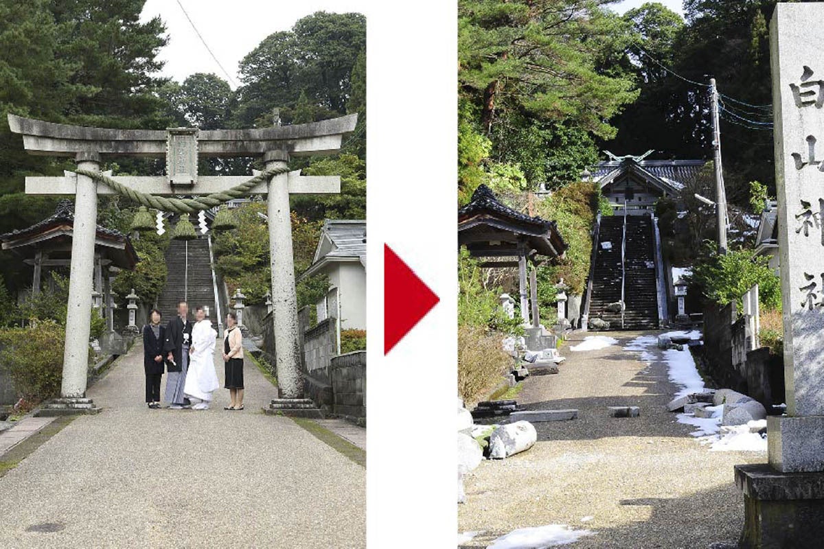 かつての白山神社の鳥居(左写真)と能登半島地震後の様子(右写真)