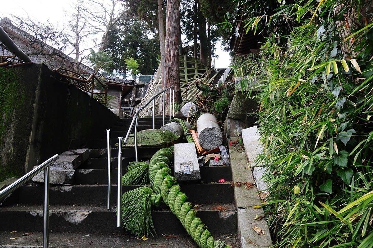 高台にある酒垂神社へ上がる参道階段、手水舎横にある鳥居も崩壊