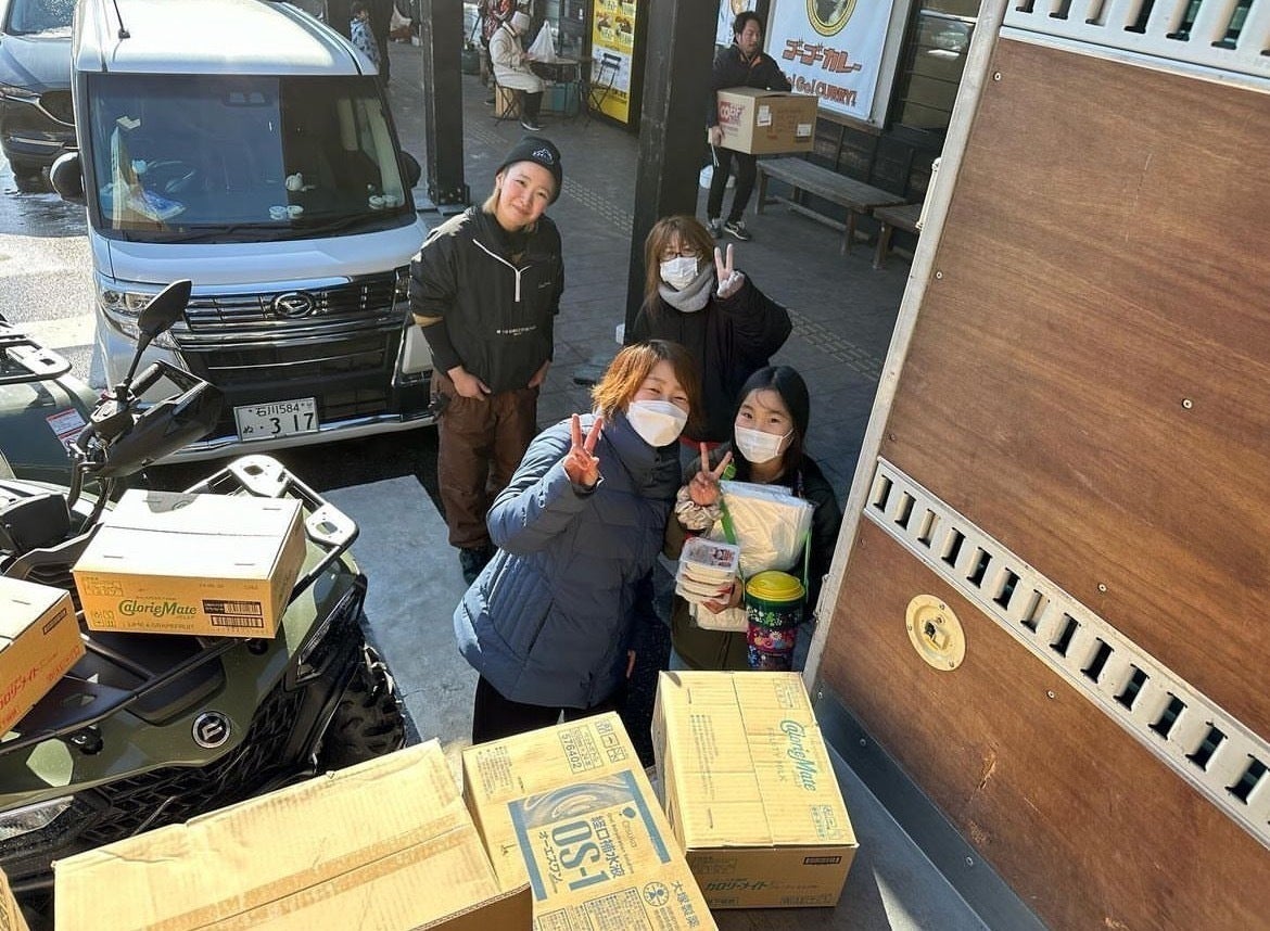 元旦の震災を受け、何か私たちにできる事は無いかと考え、今本当に必要な物資を必要な方へ届けようと思い1月13日〜18日の間、個人と会社で支援物資をかき集めて届けてきました。実際に現場をトラックで走ると、ニュースで見るよりも遥かに酷い被害状況でした。大型トラックで陥没や隆起、地割れをした道を命懸けで走り、必死で届けました。