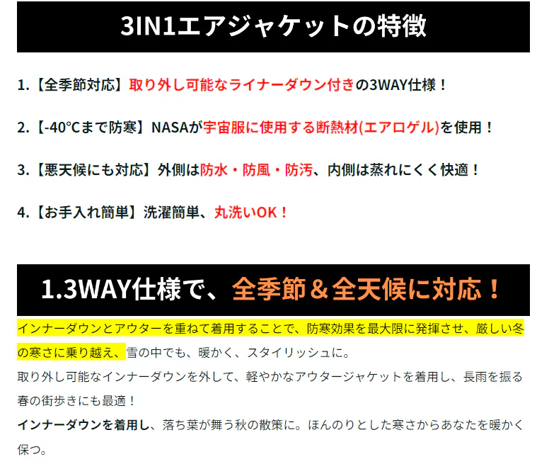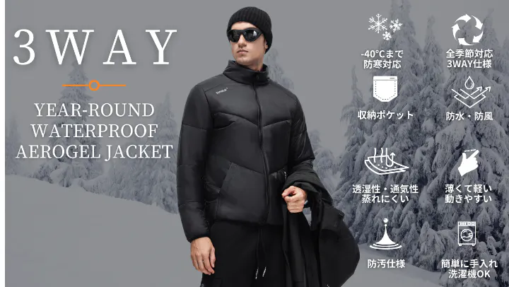 「3IN1エアジャケット」は、最新素材のエアロゲル毛羽を充填しています。その結果、軽やかさと圧倒的な保温性を兼ね備えた1着が誕生!