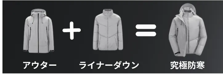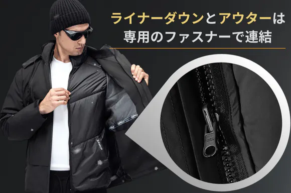 アウターとライナーダウンを専用のファスナーで連結し、1着3通りの着こなしができる3WAY仕様に進化!