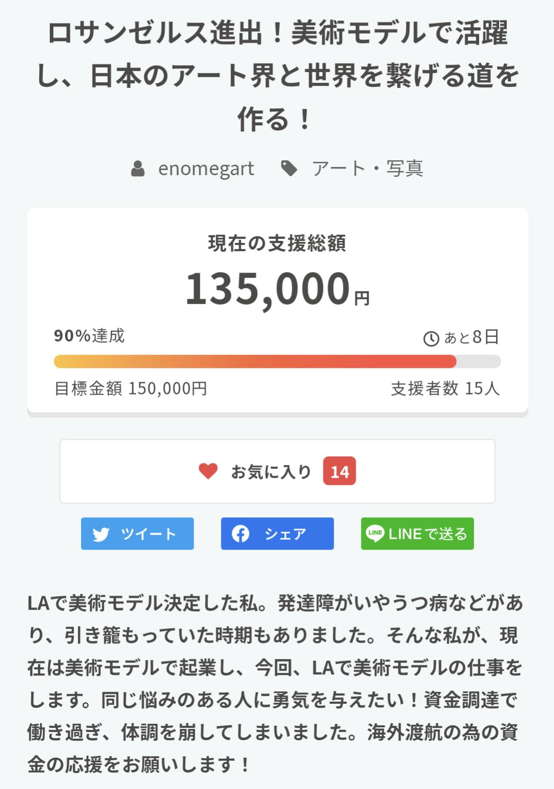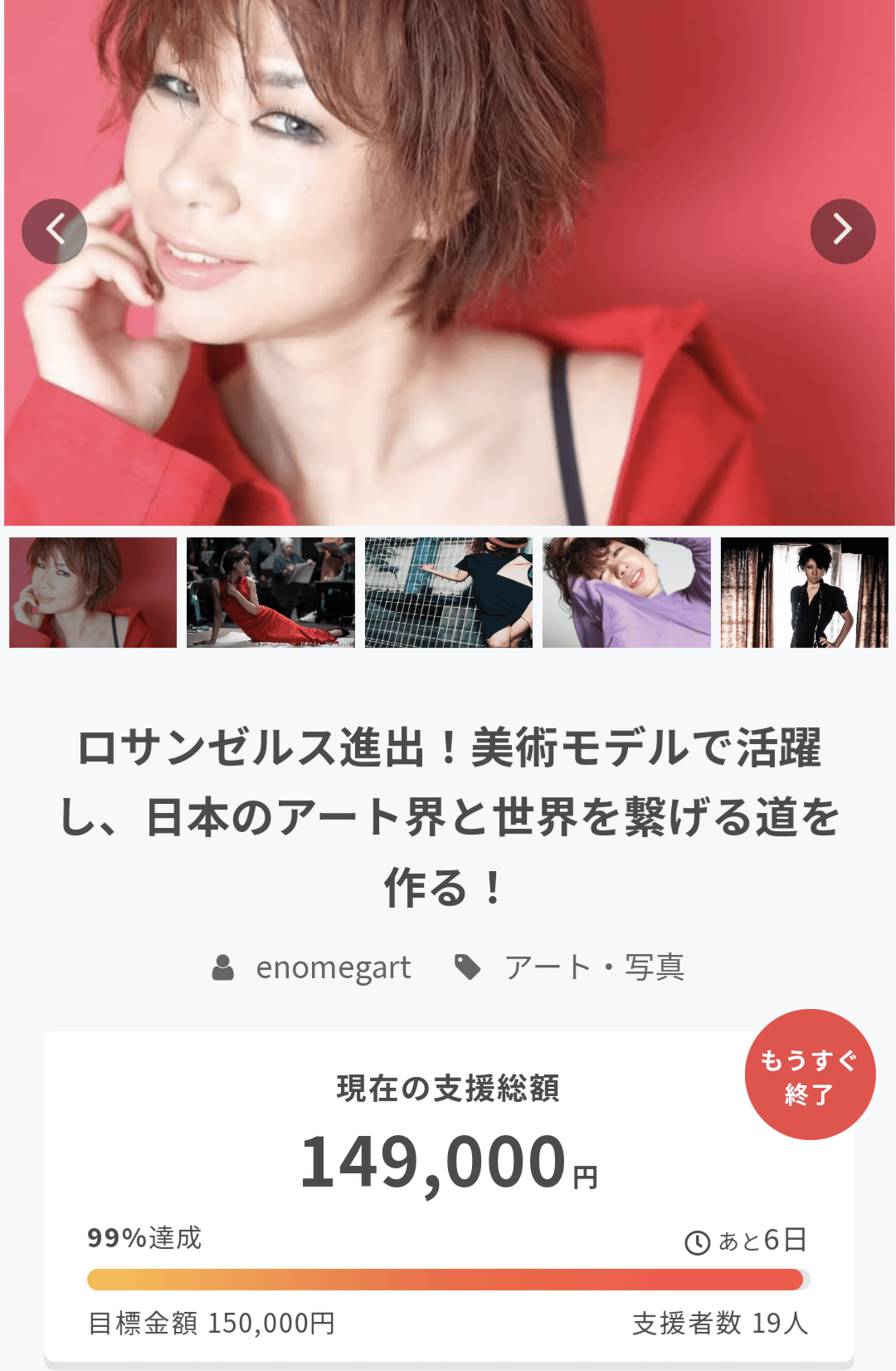 2024/02/14 21:29達成率99%です!皆様のご支援から拡散ご協力に大変感謝しております!「ロサンゼルス進出!美術モデルで活躍し、日本のアート界と世界を繋げる道を作る!」camp-fire.jp/projects/view/…https://camp-fire.jp/projects/view/738541?utm_campaign=cp_po_share_c_msg_mypage_projects_show もっと見る