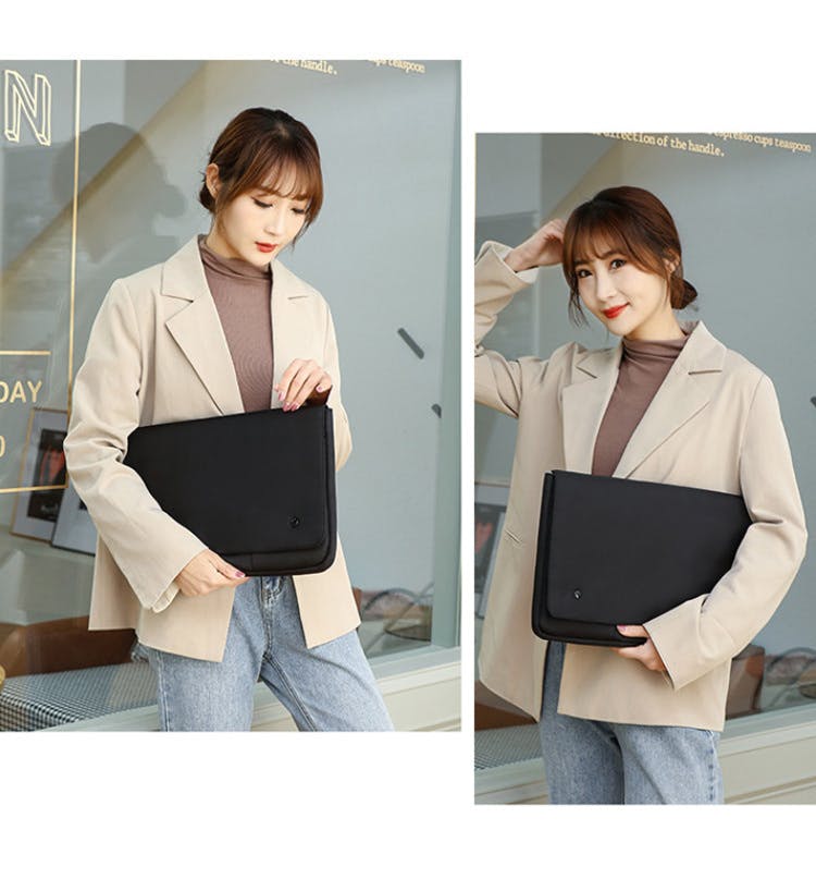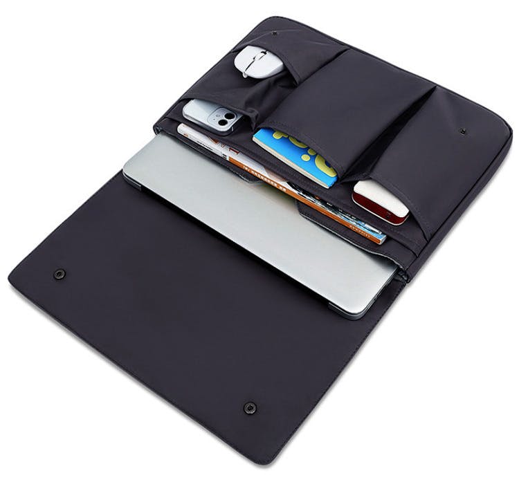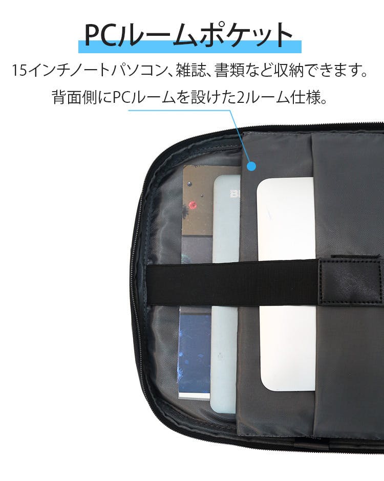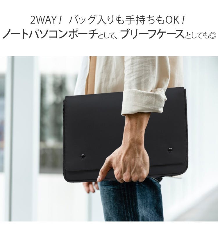 クッション付きPCポケットバッグ前面にB4サイズに対応したエンベロープ形状のメインポケット、背面側にPCポケットを設けたWポケット仕様。15.6inchのノートPCがすっぽりと入り、タブレットの保管にも最適。