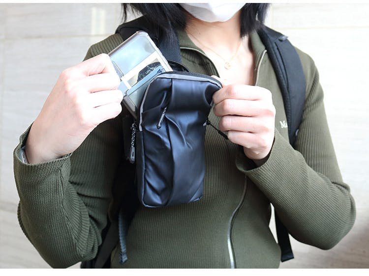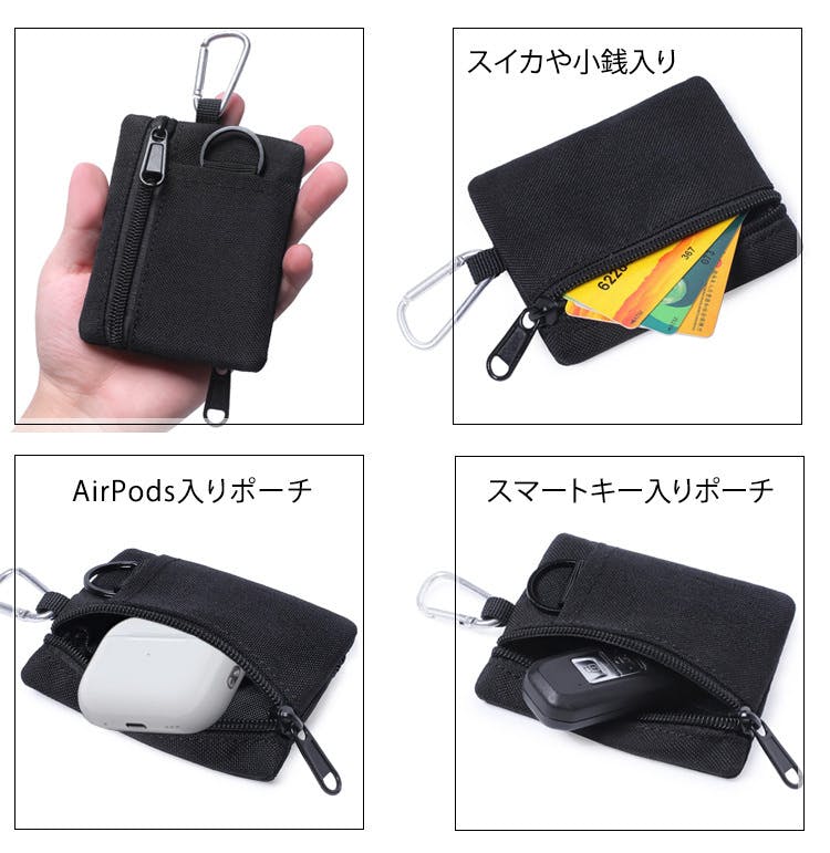 小銭やICカード、AirPods入りポーチスマホポーチはメインバッグに、ショルダーストラップにも取り付けられるアクセサリーです。