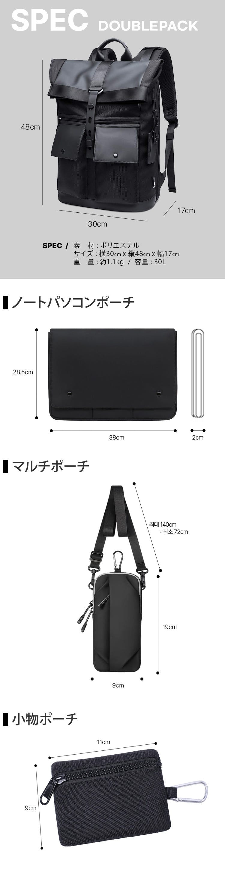 DOUBLEPACKは2ルーム構造のバックパックとマルチ機能の3つのポーチがセットになっています。