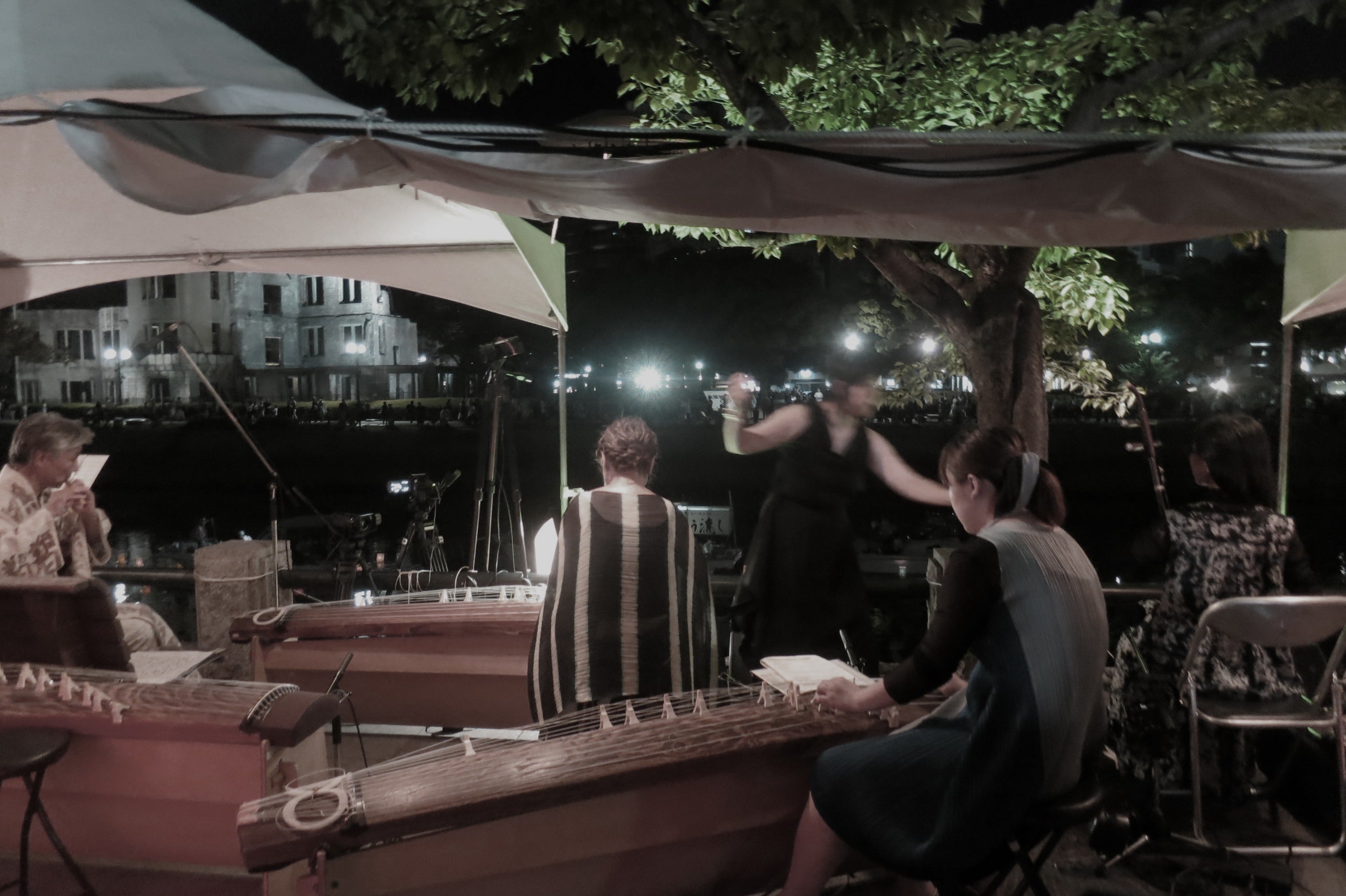 「とうろう流しミュージックセレモニー」は、8月6日に、広島の原爆ドーム前の元安川に多くの人々が平和への想いを込めて流す「とうろう流し」の行事に合わせて音楽演奏を奉納するもので、原爆死没者の供養と平和への祈りを込めた特別なセレモニーです。このセレモニーは、広島の地から、世界平和への思いを多くの人々に共有していきたいと考えのもと、数年前から昨年まで、毎年、とうろう流し実行委員会が主催し、私たちNPO法人セトラひろしまが企画制作を担当して行っていました。ここ数年来、趣旨に賛同するジャンルを超えた演奏家の参加を募り、「とうろう流しゾリステン(下記*参照)」という名のもとにプロジェクトに参加してもらい、和洋出自の異なる演奏家たち、それぞれ個々の音楽表現が十分に発揮されるとともに、時に異ジャンルの楽器どうしのセッションを通して融合し、流れるとうろうに向け、内的な交感の内に演奏を繋ぎ、時に情を起こし、時に黙し鎮め、多様な音楽の共存のうちに心に響くような感動的な音楽の環境をとうろう流しの光景に重ねてきました。