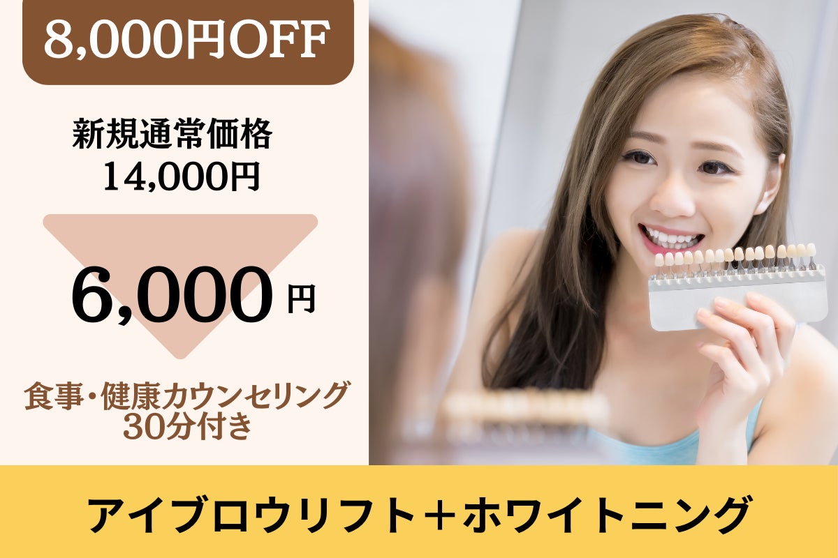 ①アイブロウリフトとホワイトニングの2つのメニューを一度に受けられる権利です。セットでお得!しかも時短です!新規通常価格14,000円より8,000円OFF