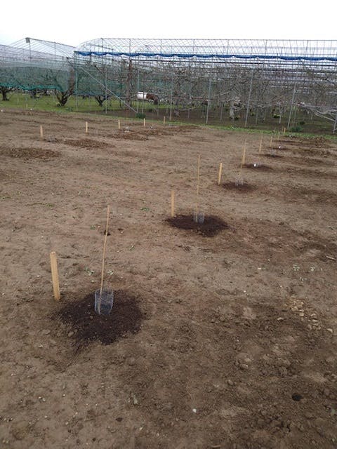 春に約90本のぶどうを新植。細い棒みたいなのがぶどうです。