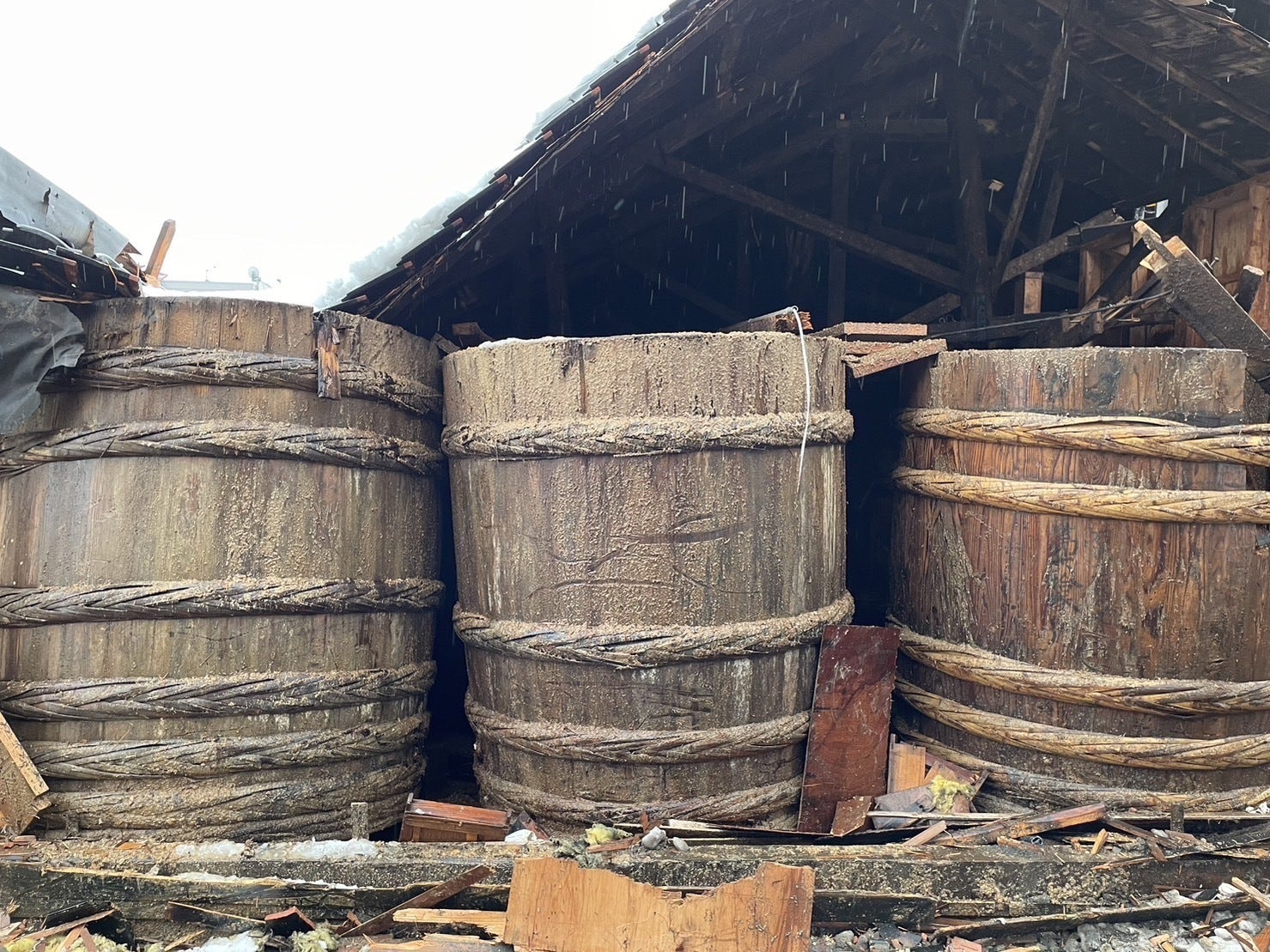 木桶は倒れていないものの、中の”もろみ”は漏れていました。