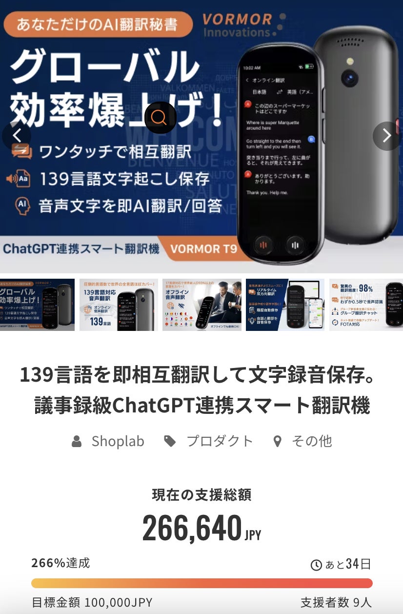 先々週スタートいたしました「VOROMOR翻訳機」プロジェクトは皆様の温かいご支援のおかげで、なんと支援者数9名&26万円を突破することができました!