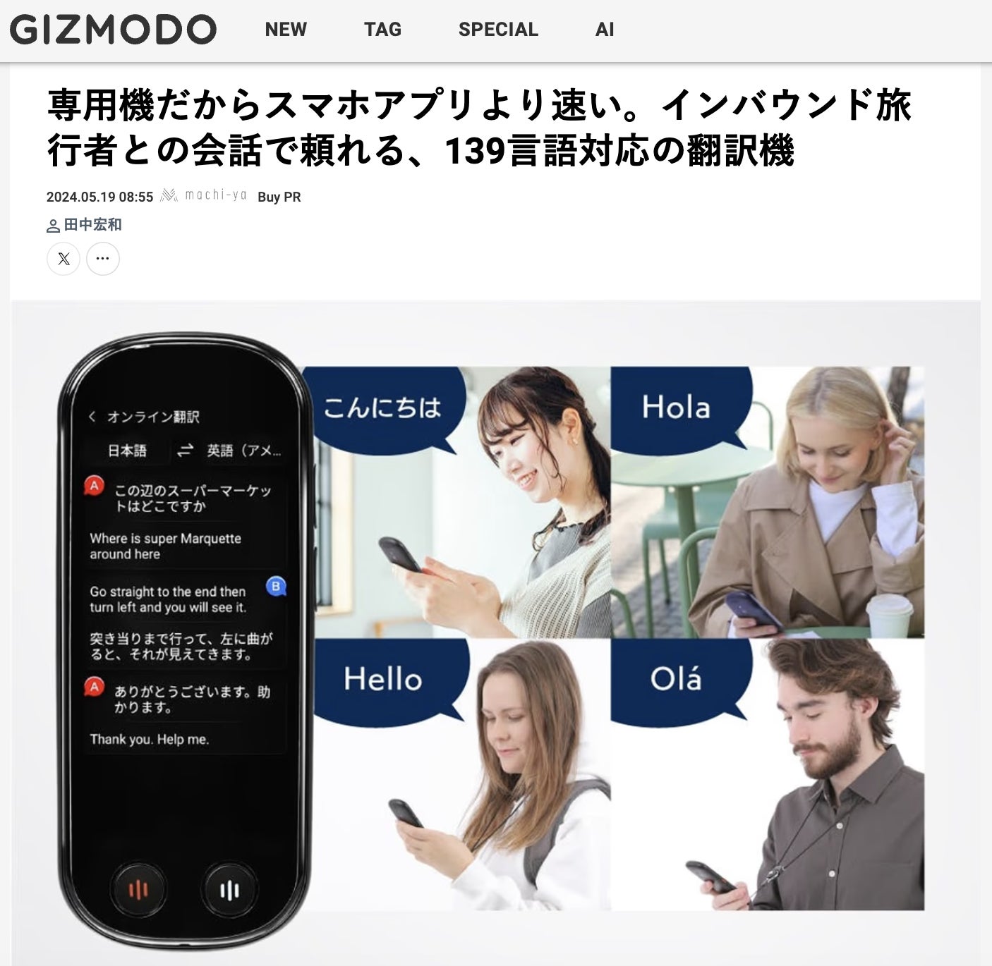 ▼GIZMODO内の記事「専用機だからスマホアプリより速い。インバウンド旅行者との会話で頼れる、139言語対応の翻訳機」