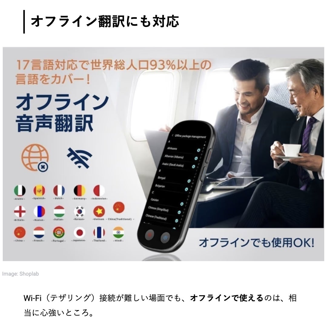 オンライン時より翻訳精度が落ち、対応言語も17言語に限られてしまいますが、いろいろな要因によってネットワークに繋げられないことは珍しくありませんので、きっと助けになるはずです。」