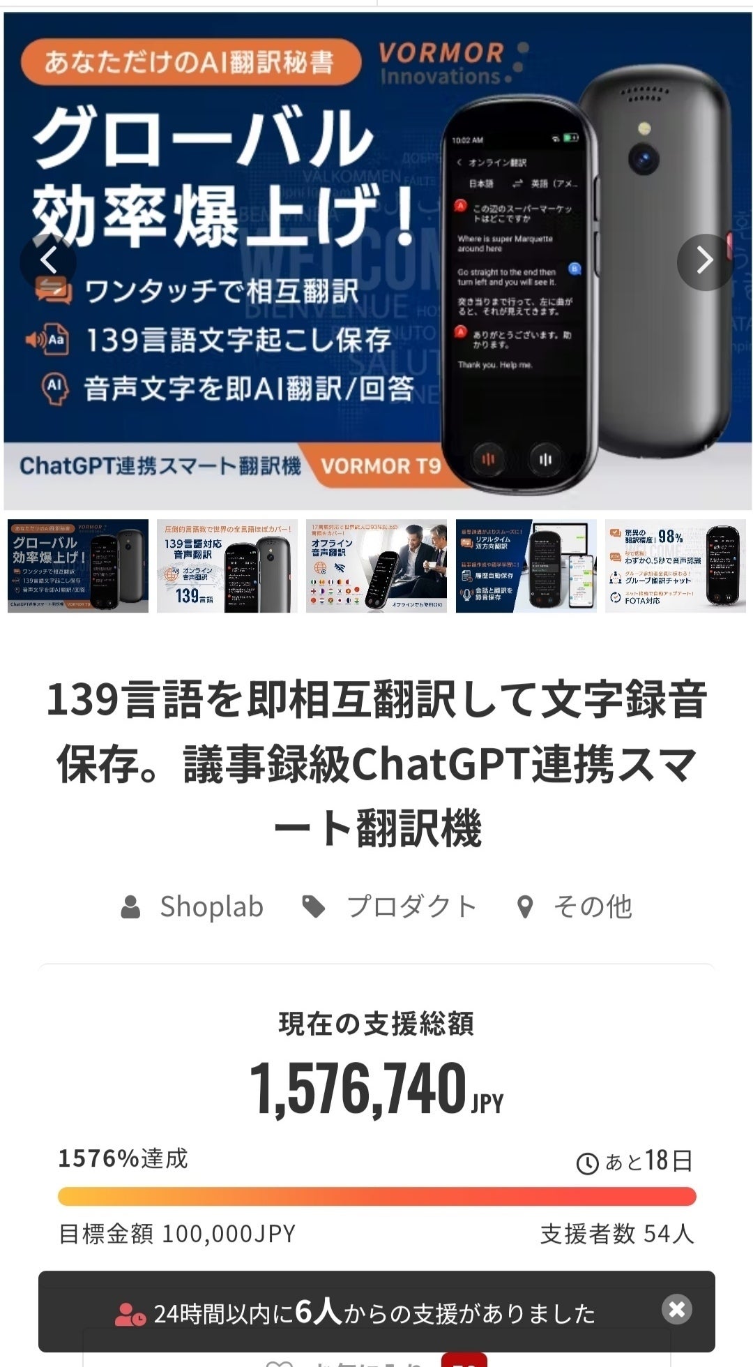 現在「議事録級ChatGPT連携スマート翻訳機VORMOR 」プロジェクトは、このレポートを書いている時点で目標金額が、なんと、、、1576%を突破!!!