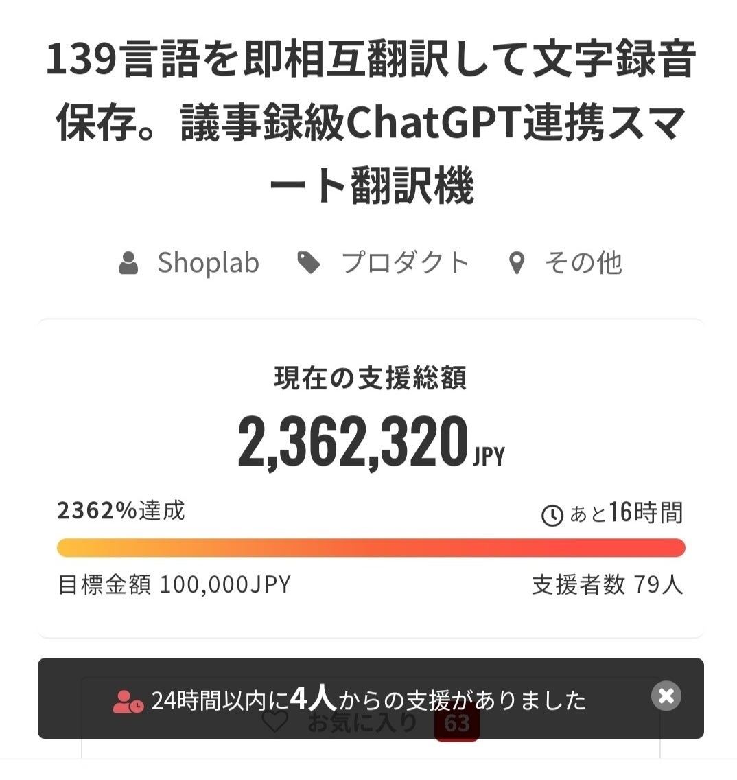 ご支援いただいた皆様、ならびにご関心いただきました皆様へお世話になっております!ショプラボの鈴木です^^現在クラファン実施中の「VORMORスマート翻訳機」プロジェクトは、27% OFFリターンがなんと完売し、目標金額は1876%を突破 、支援総額は187万円を突破いたしました!!現在も続々とご支援をいただいている状況で、皆様の多大なるご支援に大変感謝しております...!!!本当に、本当にありがとうございます*^_^*迷われている方は、よろしければこちらをご参考ください!▼GIZMODO様レビュー記事「翻訳機、こんなに賢くなってるの!?AI技術で瞬時にコミュニケーションが可能に」https://www.gizmodo.jp/2024/06/machi-ya-vormort-review-9738614.htmlまた、数量期間限定の1000円OFFのクーポンをお配りしてますので、よろしければご活用ください!配布枚数:100枚(期間中1人3回まで使用可能)クーポン利用期限:6月30日(日)23:59クーポン金額:1000円OFF(支援金額4,000円以上)適用サービス:machi-yaのみ※複数クーポンの同時使用NG※上限枚数に達した場合はご利用いただけません。▼クーポン取得方法CAMPFIREアカウントにログインした状態でこちらのリンクをクリックでクーポンが取得可能。獲得リンク:https://camp-fire.jp/mypage/coupons?token=bg6j5dL31qML5DML※ CAMPFIREアカウントに未ログイン状態でリンクをクリックした場合はログイン画面に移動します。▼クーポン使い方https://help.camp-fire.jp/hc/ja/articles/900003910726-CAMPFIRE%E3%82%AF%E3%83%BC%E3%83%9D%E3%83%B3%E3%81%AE%E5%88%A9%E7%94%A8%E6%96%B9%E6%B3%95%E3%82%92%E7%9F%A5%E3%82%8A%E3%81%9F%E3%81%84引き続きご支援のほど何卒よろしくお願いいたします。▼139言語を即相互翻訳して文字録音保存。議事録級ChatGPT連携スマート翻訳機VORMORプロジェクトhttps://camp-fire.jp/projects/738614▼お問い合わせ先:ショプラボLINE公式https://lin.ee/tRYY9itVORMOR正規代理店ショプラボ