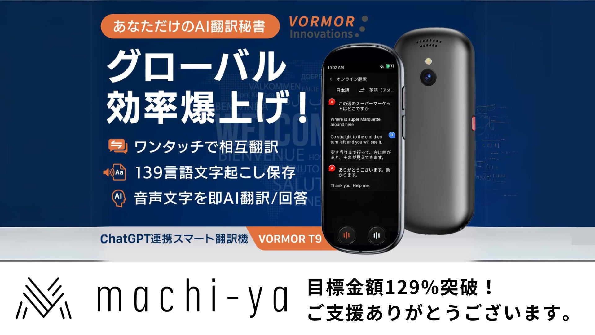 応援してくださっている皆様革新的なテクノロジーとデザインで翻訳機業界をリードするスマートデバイスブランド VORMORは、新東通信と株式会社メディアジーンの共同運営によるクラウドファンディングサイト、machi-yaの「VORMOR T9」支援プロジェクトにて、本日5月15日(水)に目標金額の129%を突破いたしました!プロジェクト開始当初より順調に目標金額を達成することができ、ここまでのご支援をいただいたことに心より感謝しております。日本未上陸、現在グローバル展開中の「VORMOR T9」支援プロジェクトは6月30日(日)まで実施予定です。現在も最大27% OFFのリターンや、通常5営業日以内に配送するリターン(速配割)を数量限定で用意しており、すぐにVORMOR T9を体験いただけます。引き続き、ご支援のほどよろしくお願いいたします。▼ VORMOR T9支援プロジェクトhttps://camp-fire.jp/projects/view/738614▼ お問い合わせ先は、弊社LINE公式でご連絡いただけると早くてスムーズです。https://lin.ee/xYVCxbn※ 2024年2月16日 Makuakeで支援プロジェクト公開時点での自社調べ。日本国内で販売されている翻訳機製品と比較した結果です。