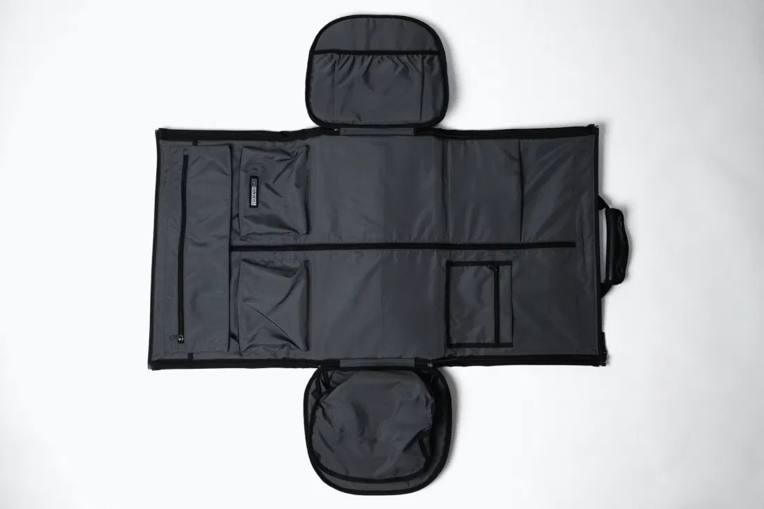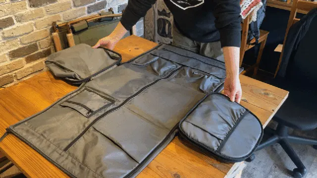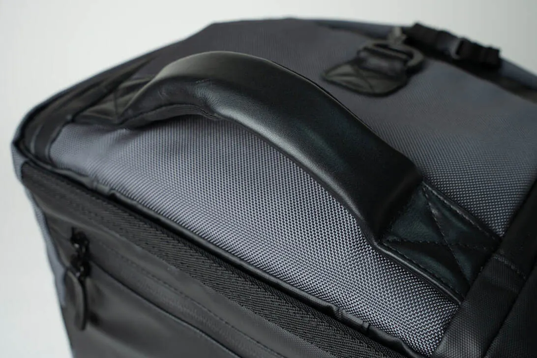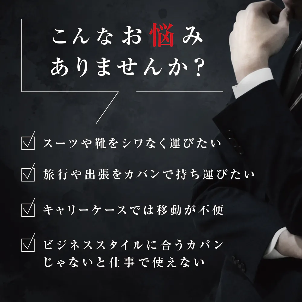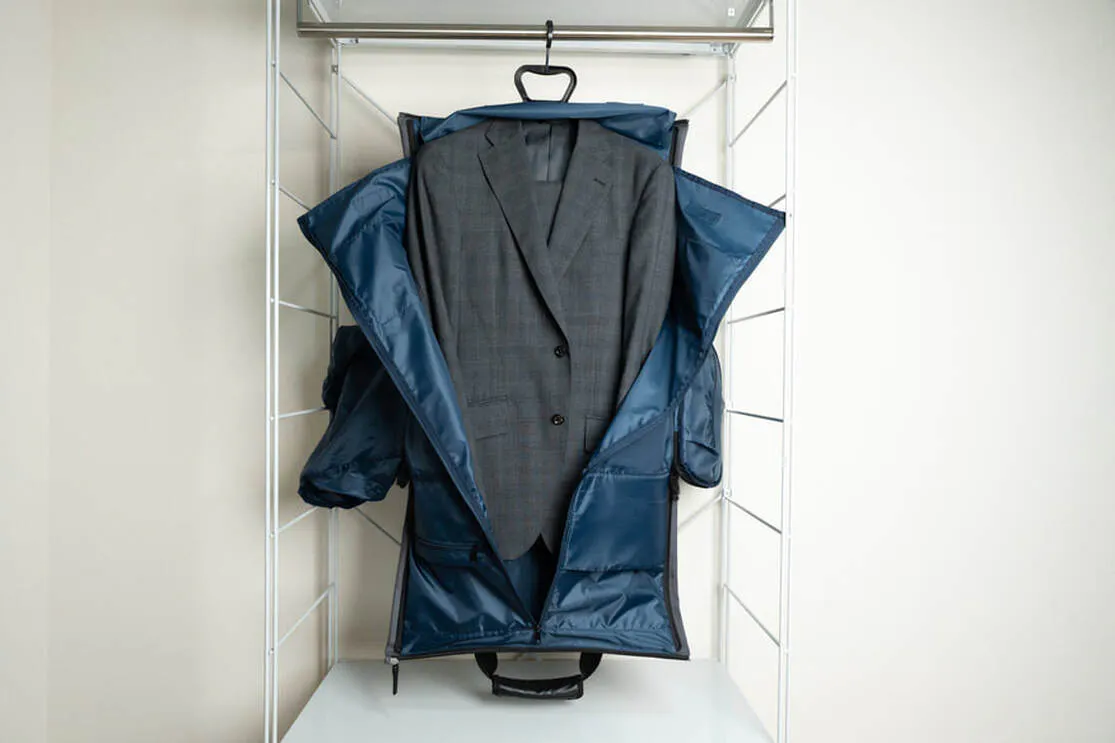 生地を張りのある素材にしたことで、カバンの型崩れを抑え、中のスーツをシワなくキープ。