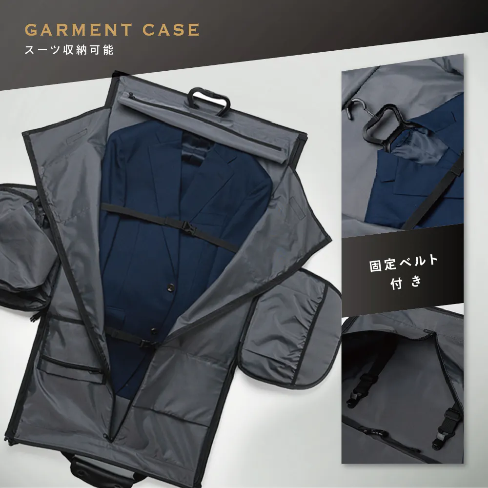 さらにサイド2本+底2本の固定ベルトで、スーツをしっかり固定。シワとヨレを防ぎます!