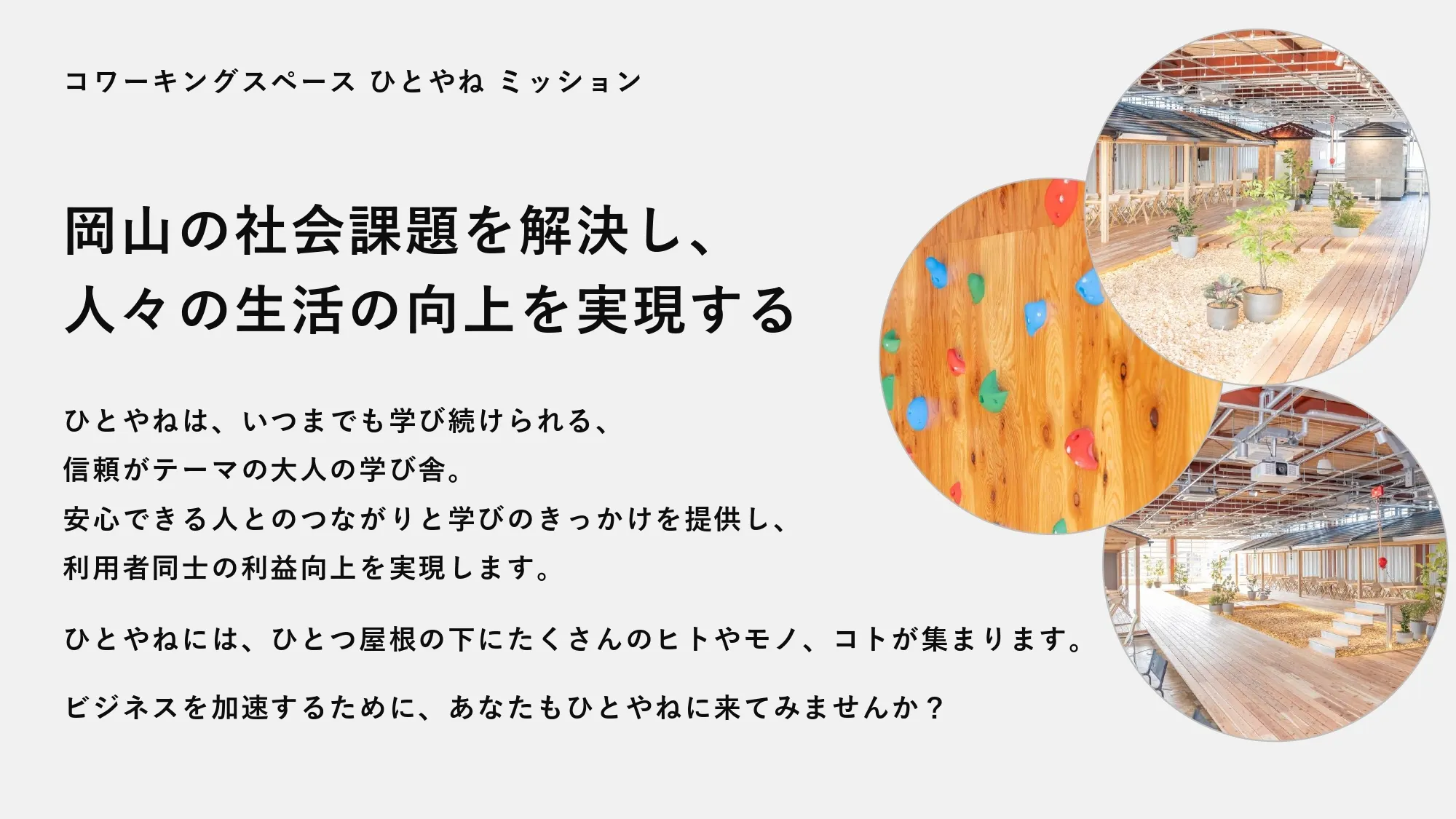 はじめまして。「ひとやね」です。私たちは、日本初の小屋がある郊外型コワーキングスペースを運営しています。2024年4月から岡山県岡山市古新田にて本格オープンしています。