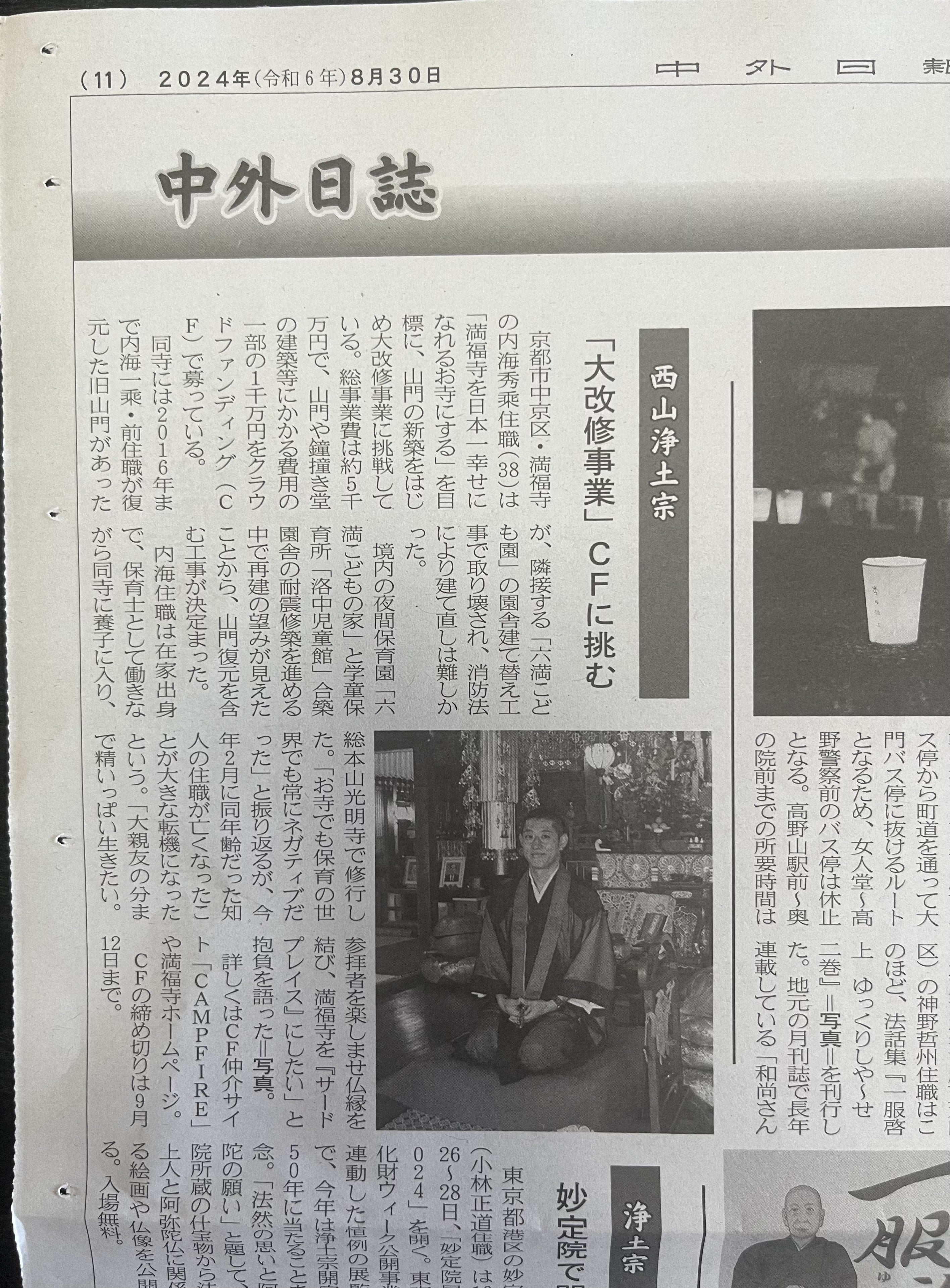 宗教と文化の専門新聞の中外日報社様が満福寺のクラウドファンディングのことを取材していただきました。