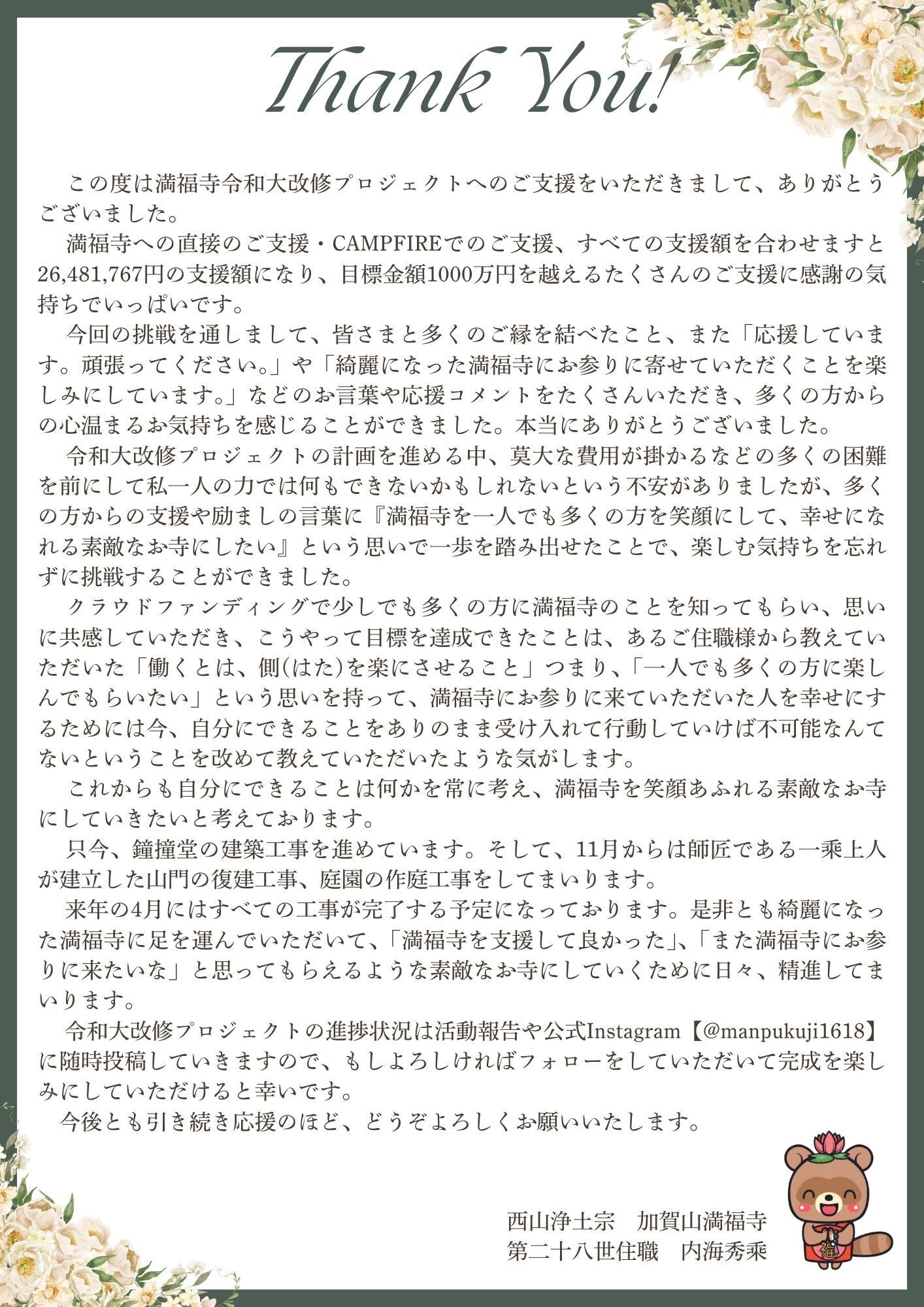 詳しくは満福寺のホームページ(https://seizan-manpukuji.net/)か満福寺公式Instagram【@manpukuji1618】に支援方法を掲載していますので、そちらからお願いします。