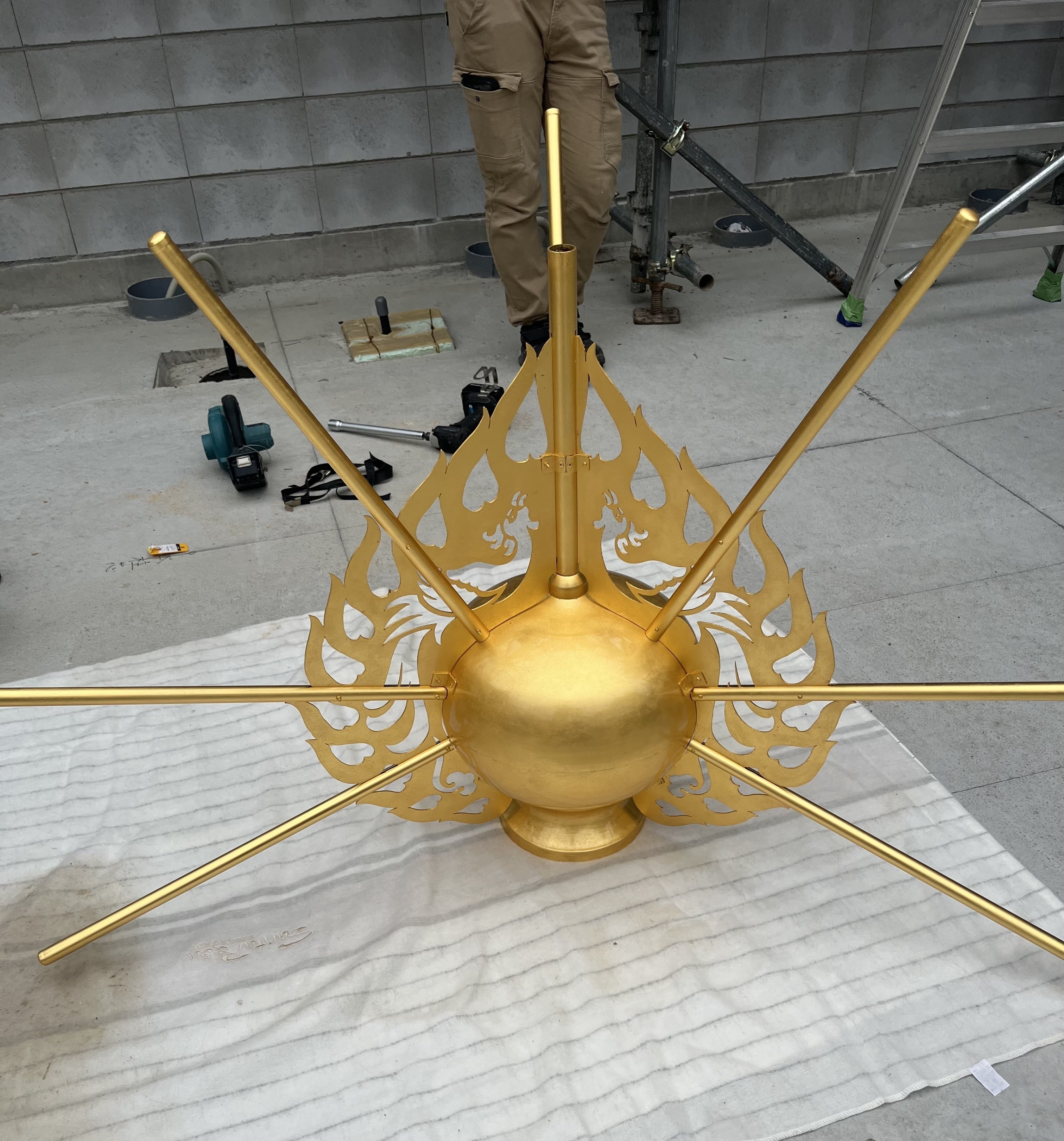 先週、鐘撞堂の宝珠の金箔張りが出来上がり、鐘撞堂の屋根に設置が完了しました。