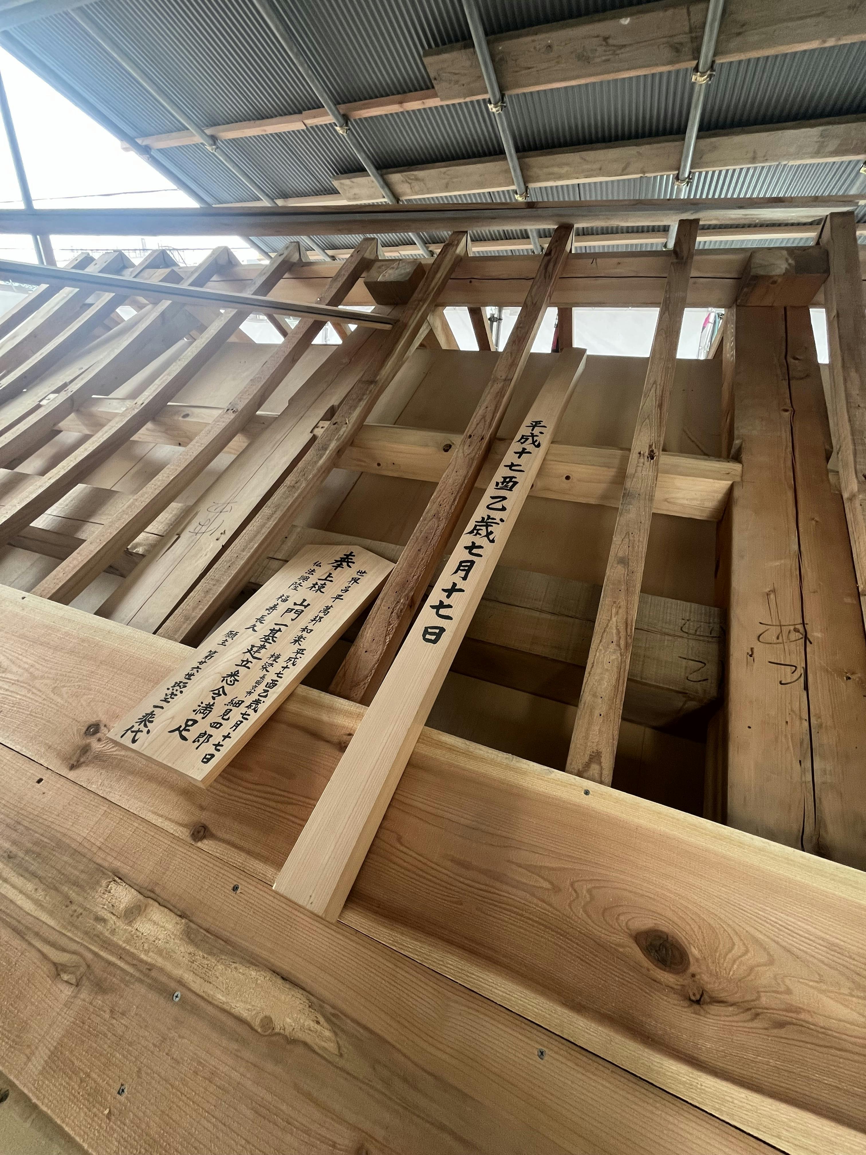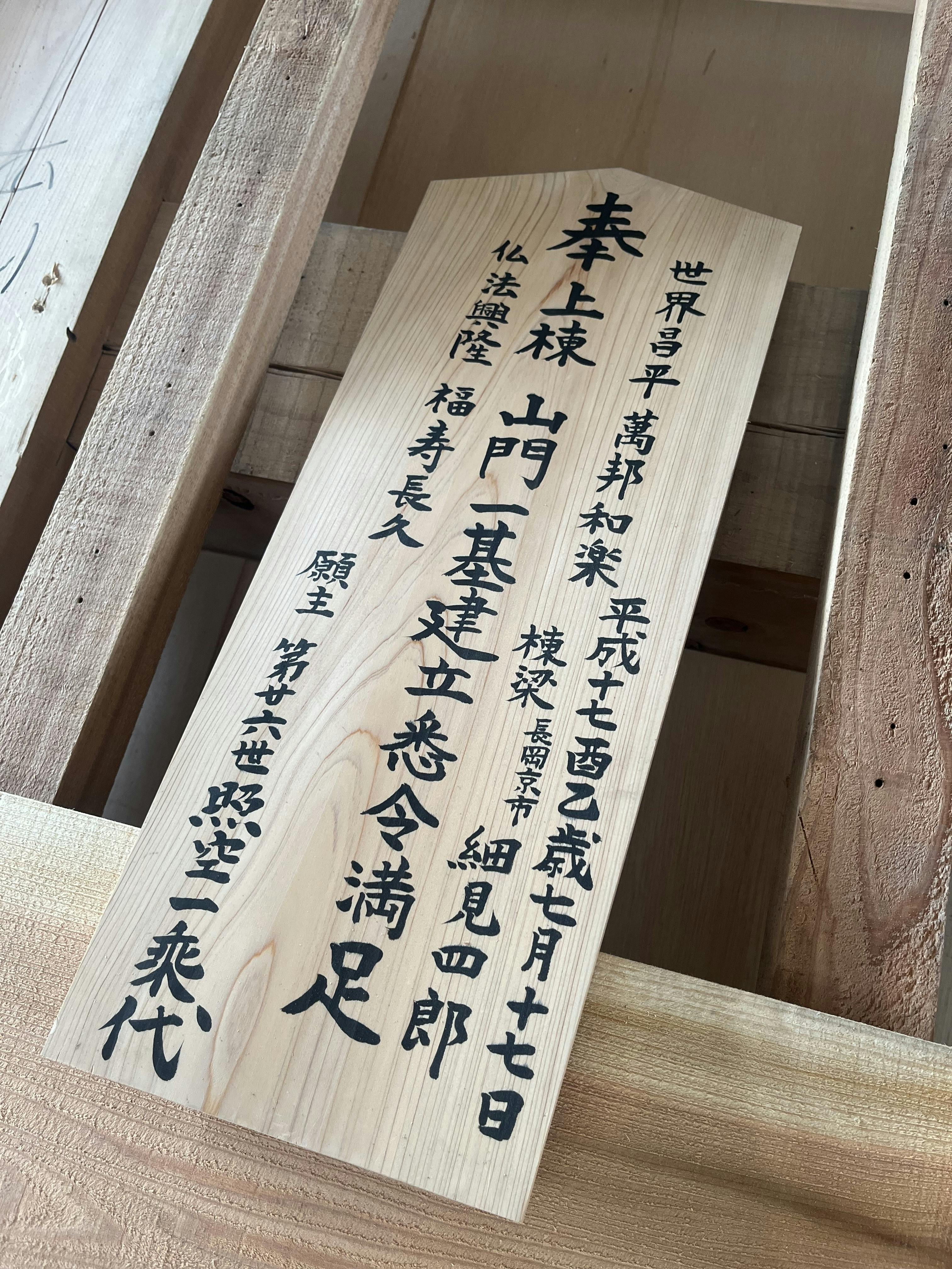 先週、山門の復建工事をお願いしている。細見工務店の職人さんから「来週には山門に瓦をのせる作業があるので、今しか棟札を見ることができないので是非見てください」と声をかけてもらったので師匠が山門を建立したときに書いた棟札を見させていただきました。