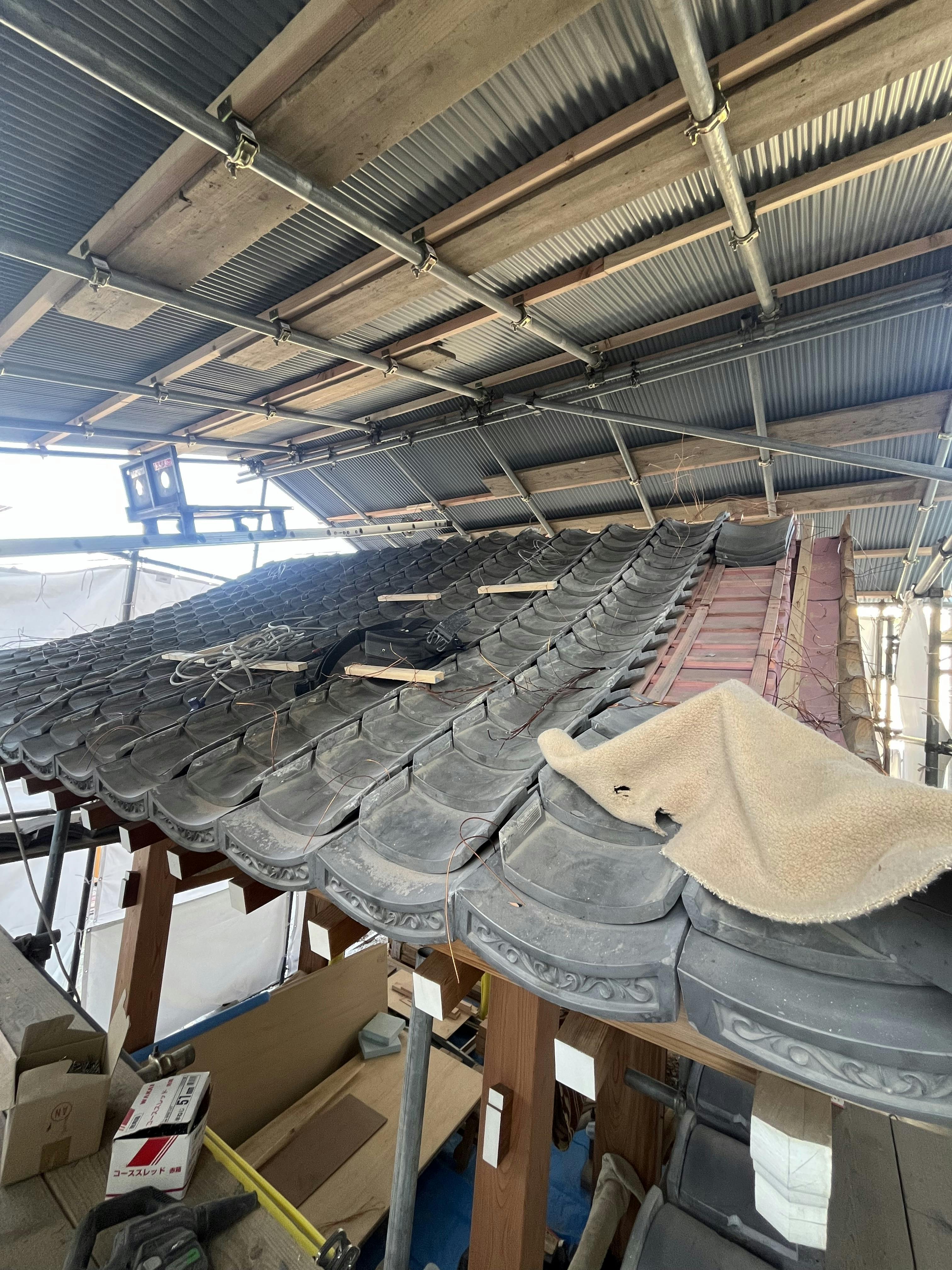 山門復建工事ですが今週に入り、山門の屋根瓦を葺く工程に入っています。