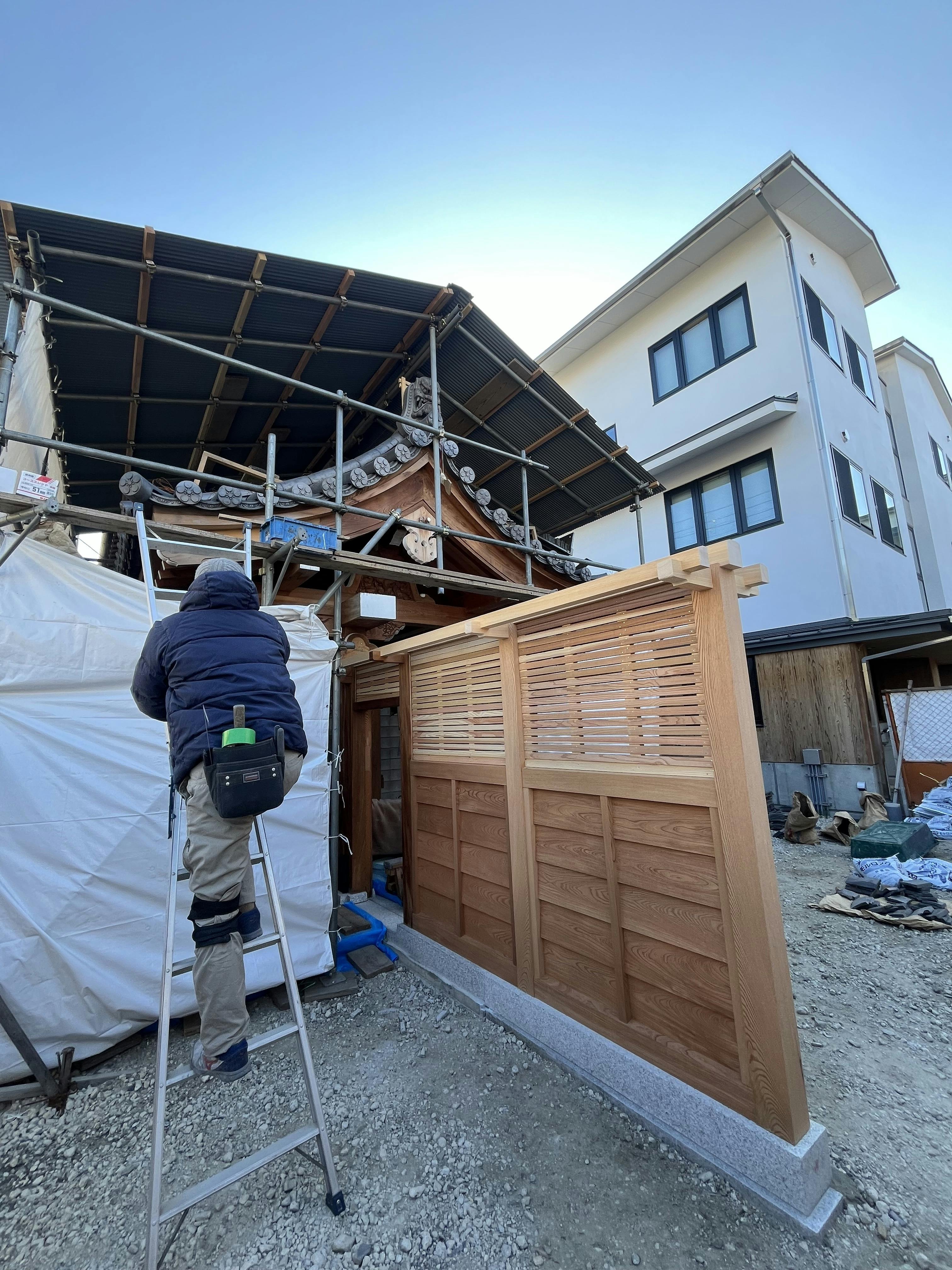 満福寺大改修工事ですが、山門の屋根瓦を葺く工程もだいぶ完成に近づいています。