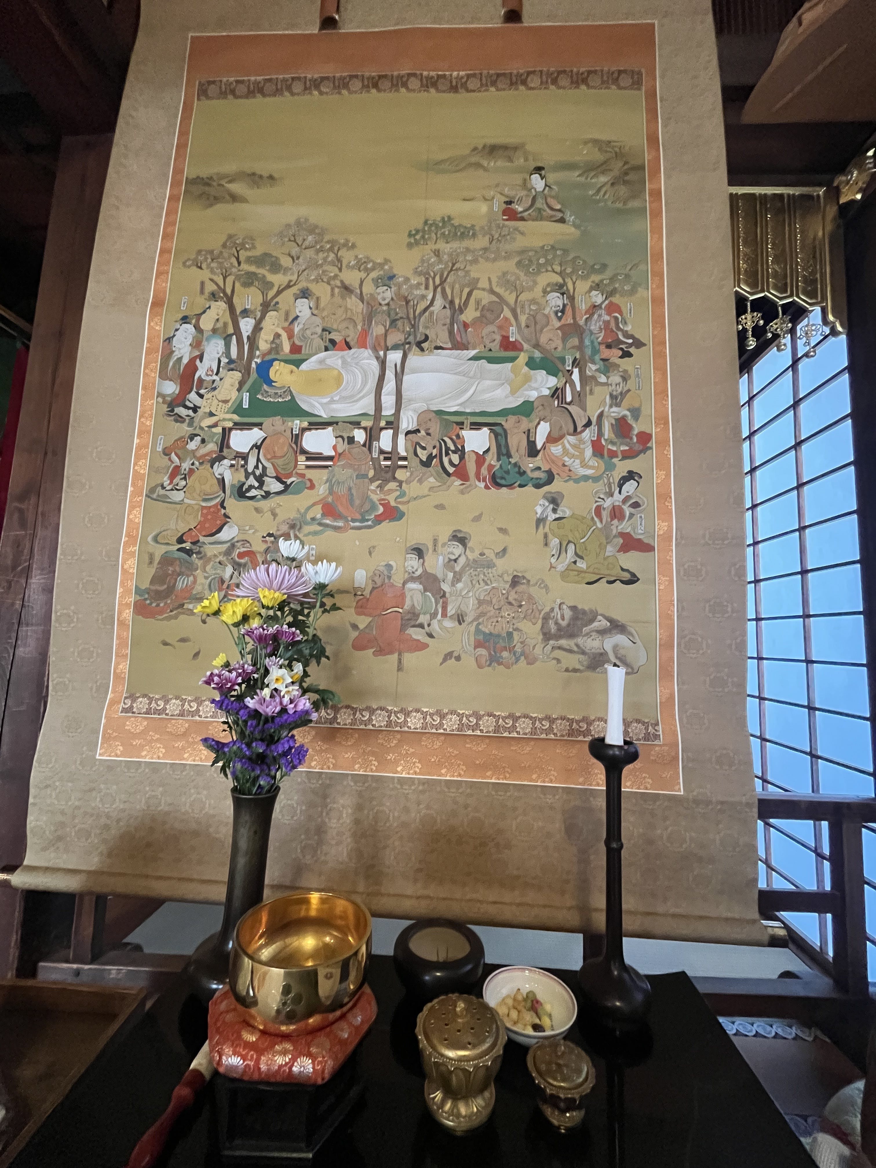 涅槃会のお勤めは、満福寺の本堂でお釈迦が亡くなられたことを偲ぶお勤めであり、幼児組の子どもたちと一緒にお勤めをしました。