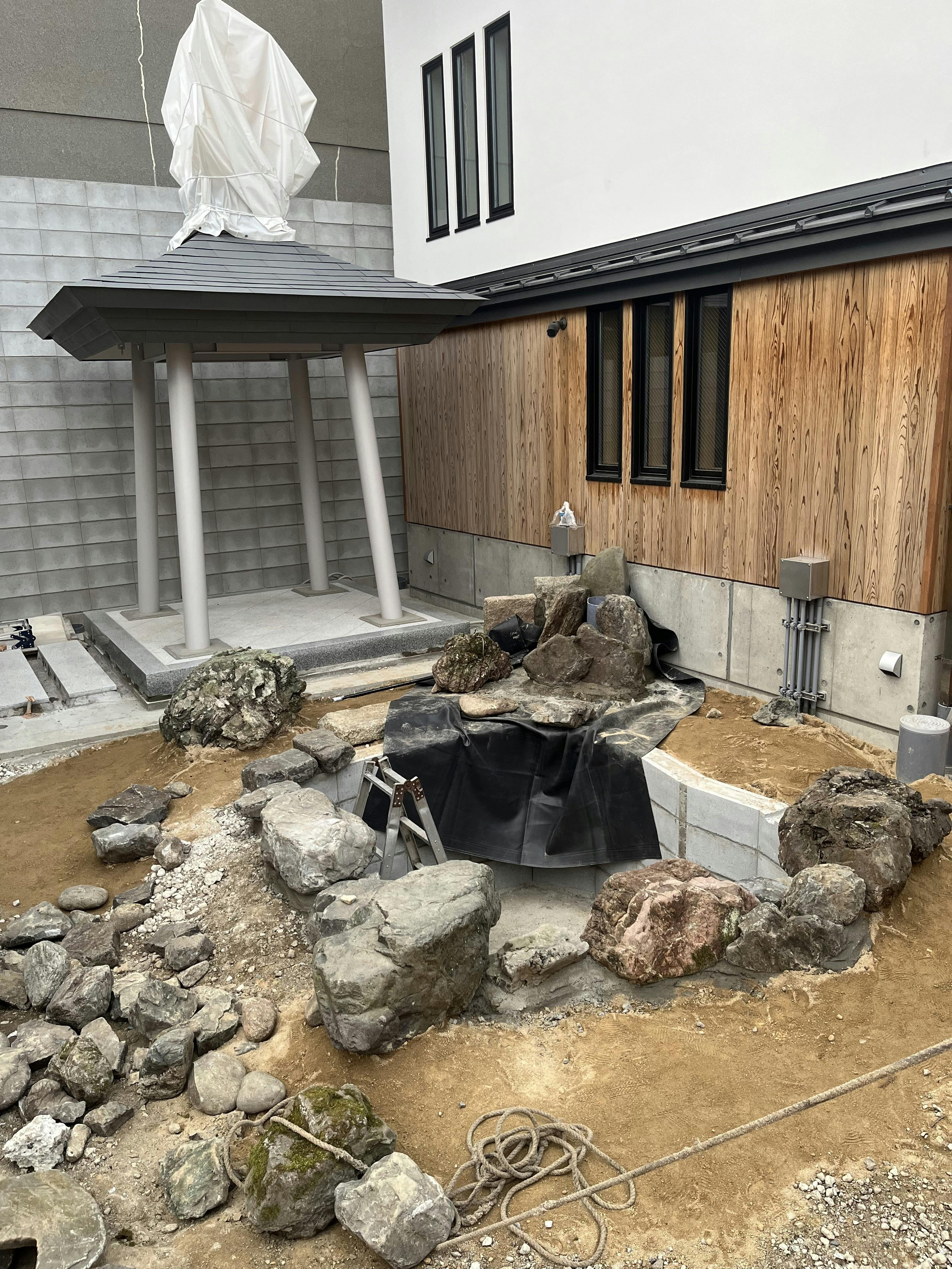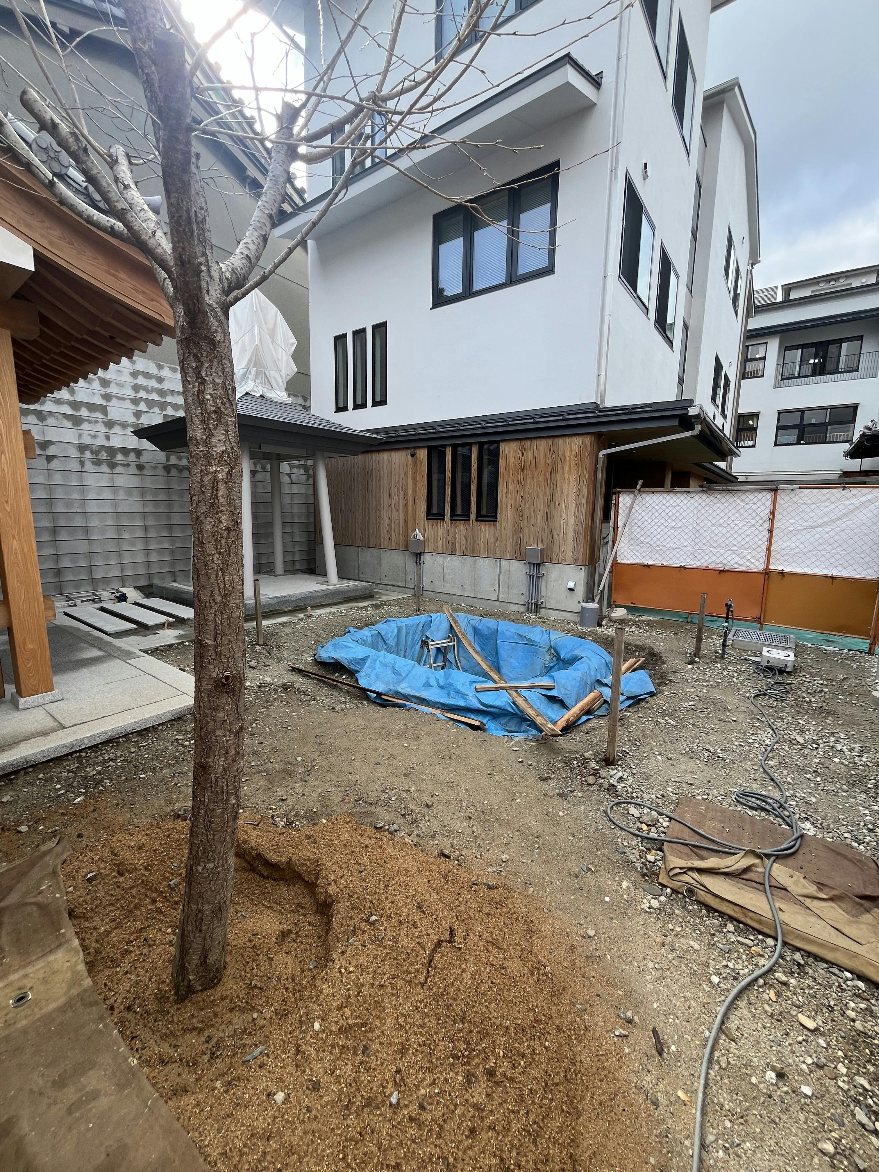 只今、『西賀茂造園』様に庭園の池を作る作業をしていただいています。