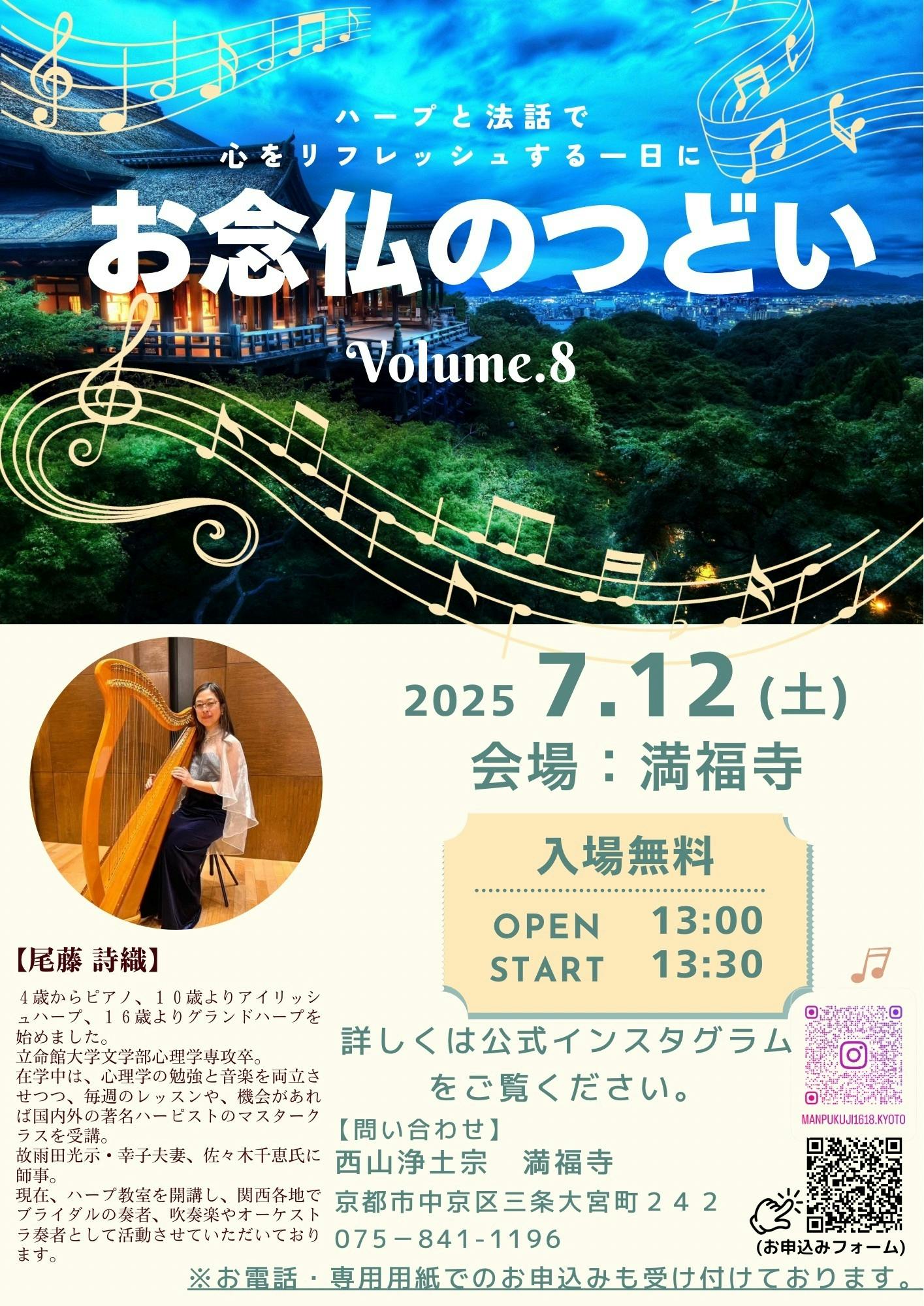 今年はハープ演奏である尾藤詩織さんにお越しいただきハープの演奏と法話をする予定です。