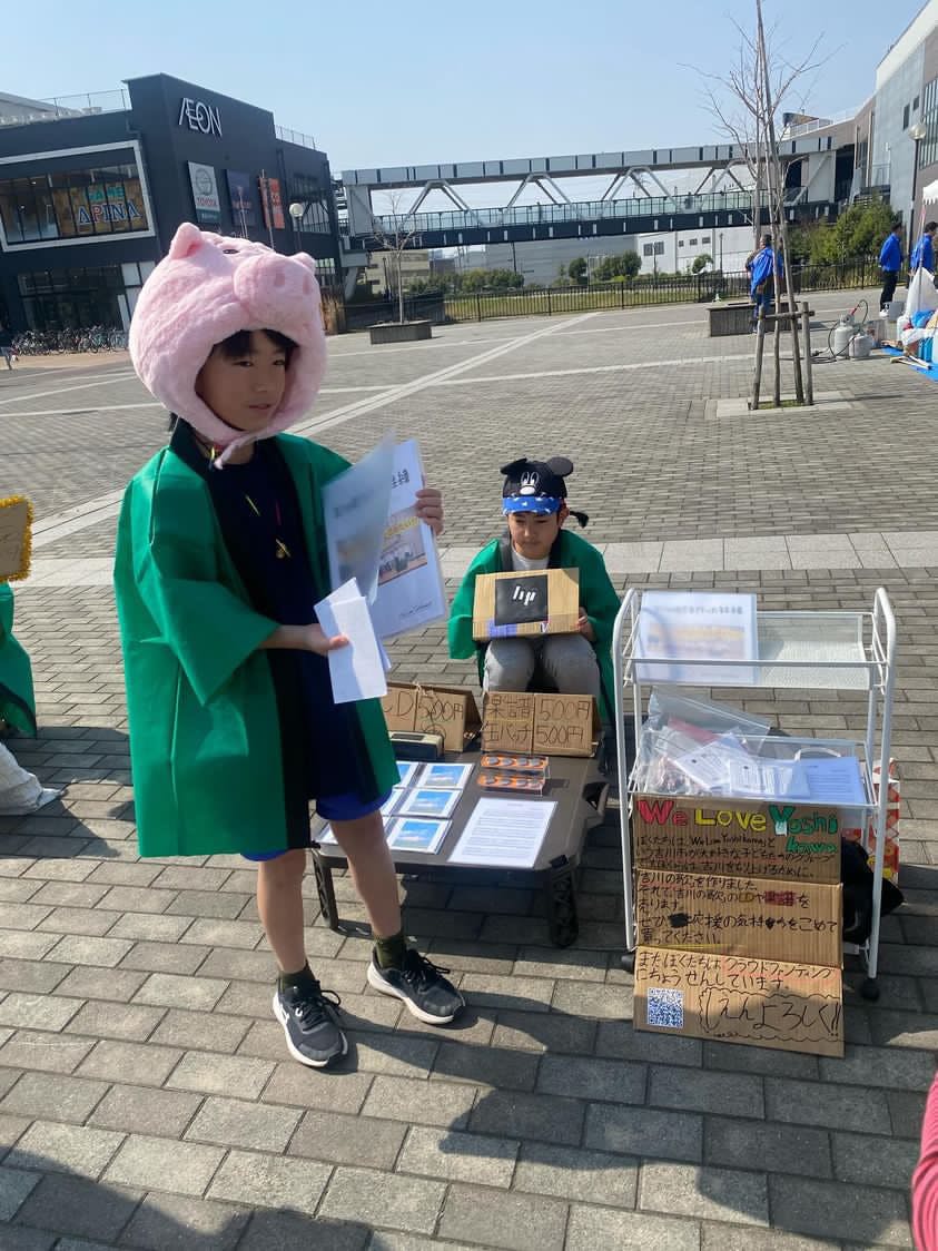 キッズタウンは、他にも何回かそのようなイベントを企画してくださったりしてくれています。僕は、「吉川の歌」のCDや楽譜、なまずのオリジナル缶バッチなどを販売しました!たくさんの人に買ってもらえたので、すごく嬉しかったです。また、チラシをどのように配っていくかも学んだり宣伝の仕方も学んだので、これから活動を広めていくときに役立てるように頑張ります。