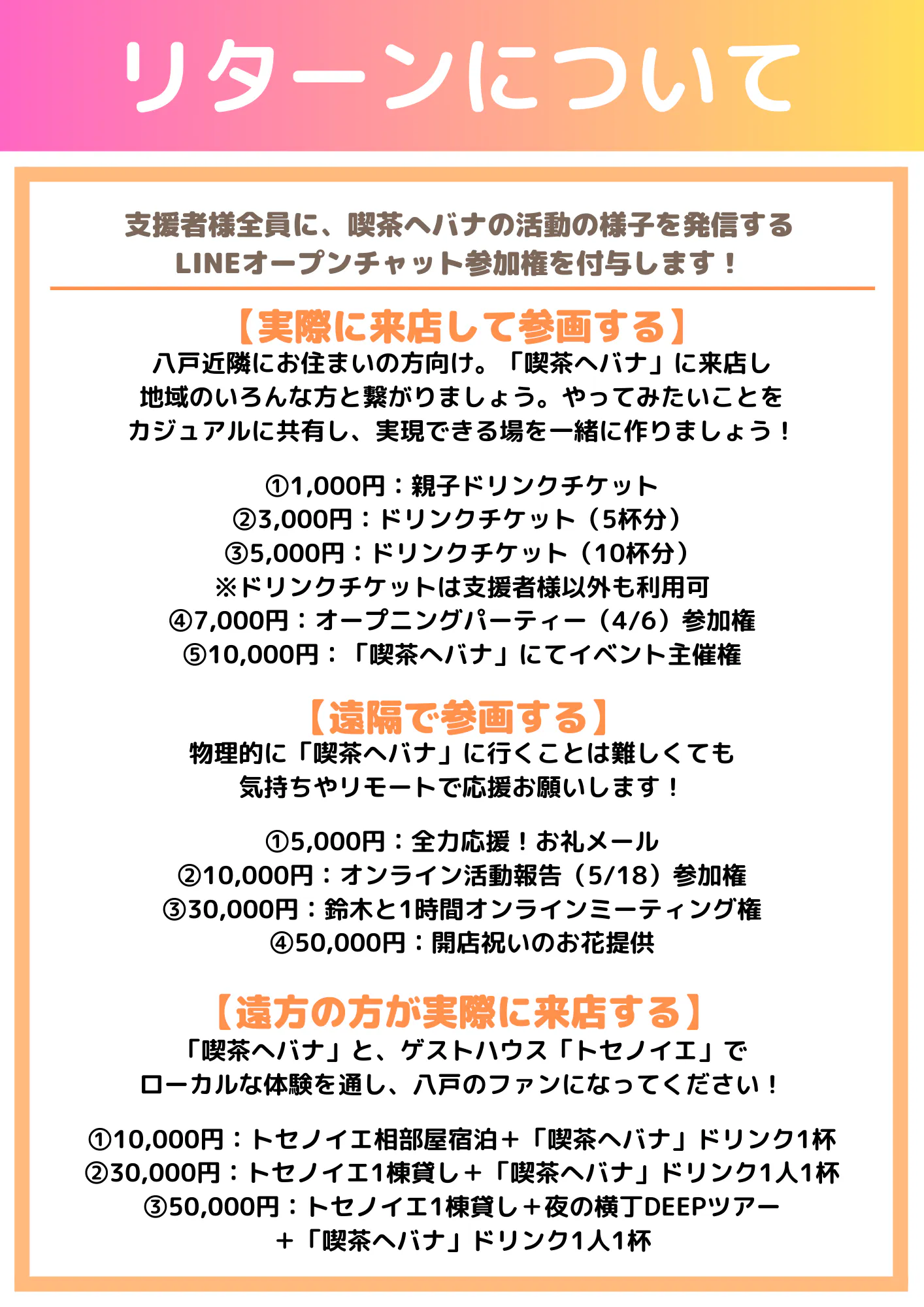 ・「喫茶へバナ」そのものが持つ価値・そこに関わるワクワクを発信し、皆様にも参画していただく