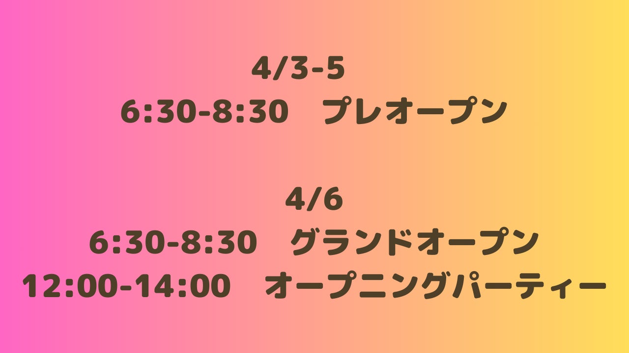 2024/03/31 10:21いつも応援いただき、ありがとうございます。\オープニング日が決まりました!/4/3(水)-5(金) 6:30-8:30 プレオープン来ていただいた皆様にご意見を伺い、改善しながら営業する3日間。4/6(土) 6:30-8:30 グランドオープンより多くの皆様に来ていただき、盛大に開業します!リターンの「開業祝いのお花」もご用意し、華やかで心躍るひとときをお楽しみください。また、メディアの方にもこの日に取材の対応をさせていただきます。12:00-14:00 オープニングパーティークラウドファンディングのリターンで「オープニングパーティー」をご選択いただいた支援者様限定のパーティーです。土曜の昼下がり、春の陽射しにあたりながら、美味しいお料理とお酒を楽しめたらと思います!こちらのリターンですが、本日23:59まで受付可能ですので、これからご支援いただける方はぜひご選択ください!クラウドファンディングも本日が最終日!最後まで追い込みます。応援よろしくお願い致します! もっと見る