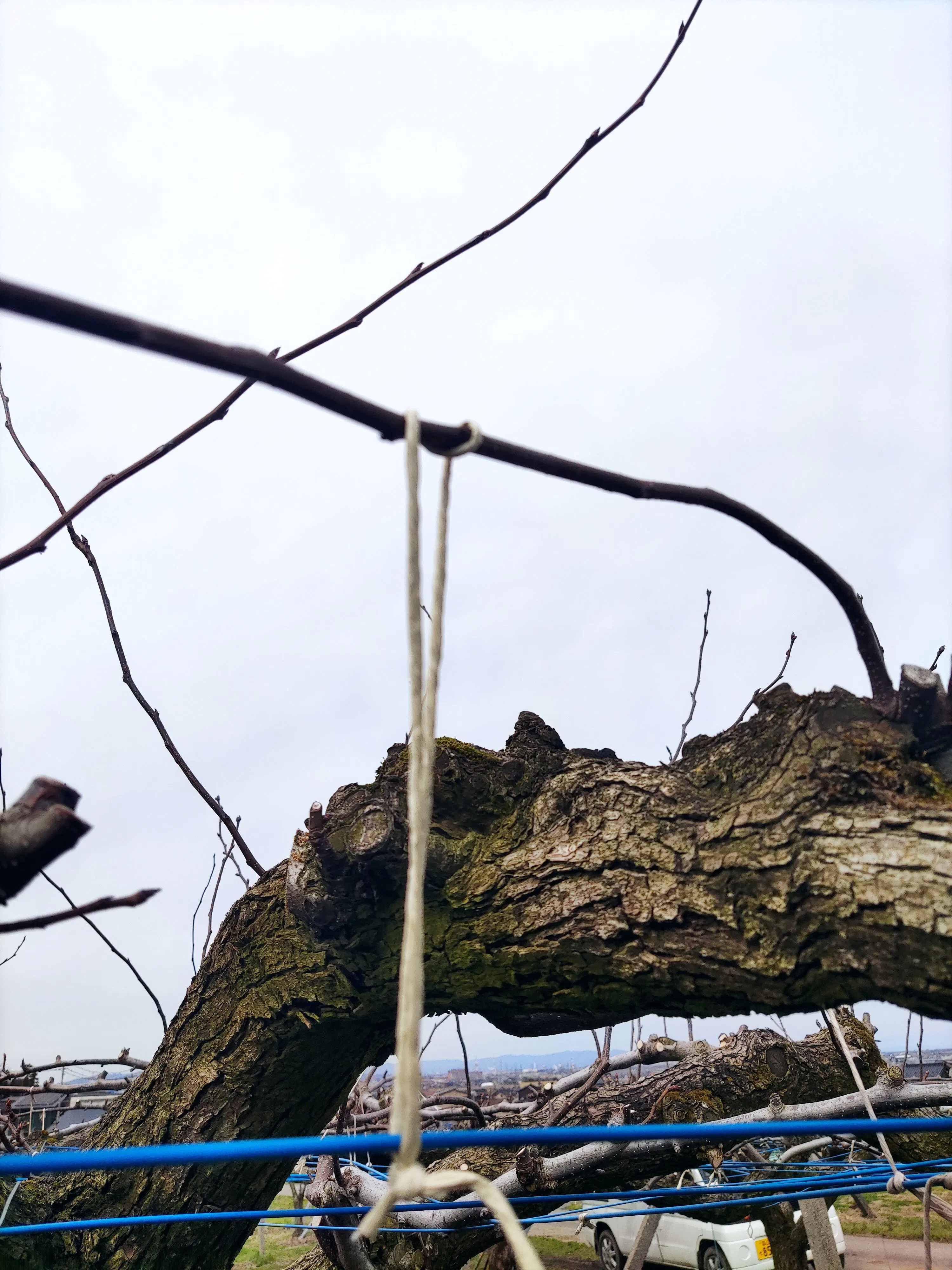 2024/02/17 19:49現在の作業は、剪定(せんてい)と誘引という作業です。地味な作業ですが、樹の形を整えて、棚線という針金の太い線に枝を倒し紙のヒモでしばる作業です。樹の養分をなるべく均一にしかも、花芽がたくさん付いている枝を選んで切っていく複眼的な視点で考えていく作業でもあります。 もっと見る
