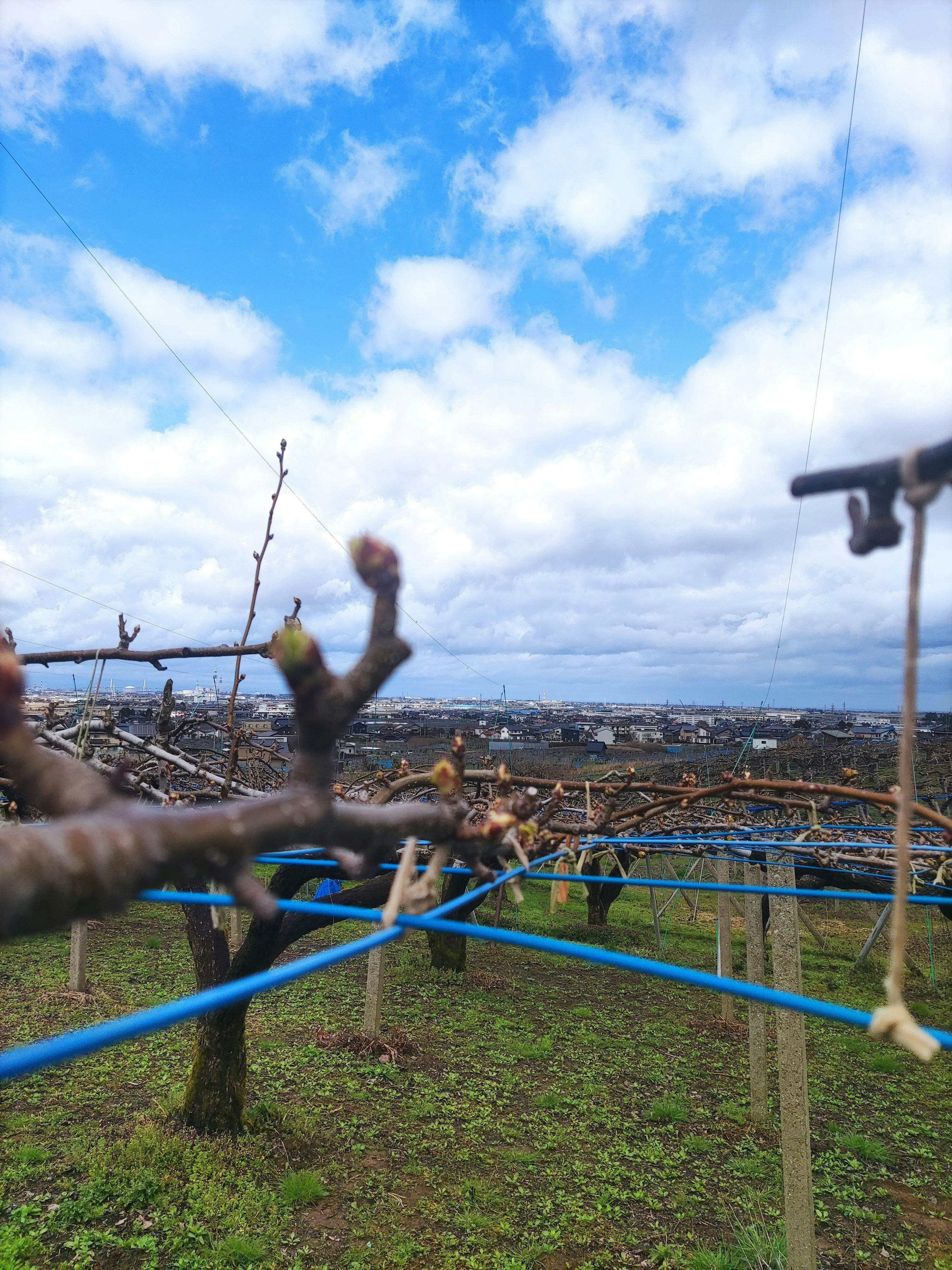 青い線に枝を倒して紐結ぶ誘引作業があと13本で終了します。
