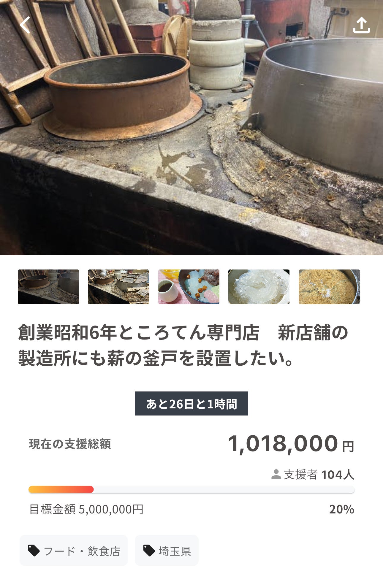 おかげさまで皆さまからご支援いただいた金額が100万円を突破いたしました。大変ありがとうございます。来週よりいよいよ釜戸作りが始まります、進捗状況をSNSなどでご報告してまいりますのでご期待ください。クラウドファウンディングの締切が今月末となっております。引き続きご協力、ご支援よろしくお願い致します。開店をしたあかつきには皆さまのご期待をそうよう精進いたします。あんみつ・ところてん 水嶋商店 店主 近藤