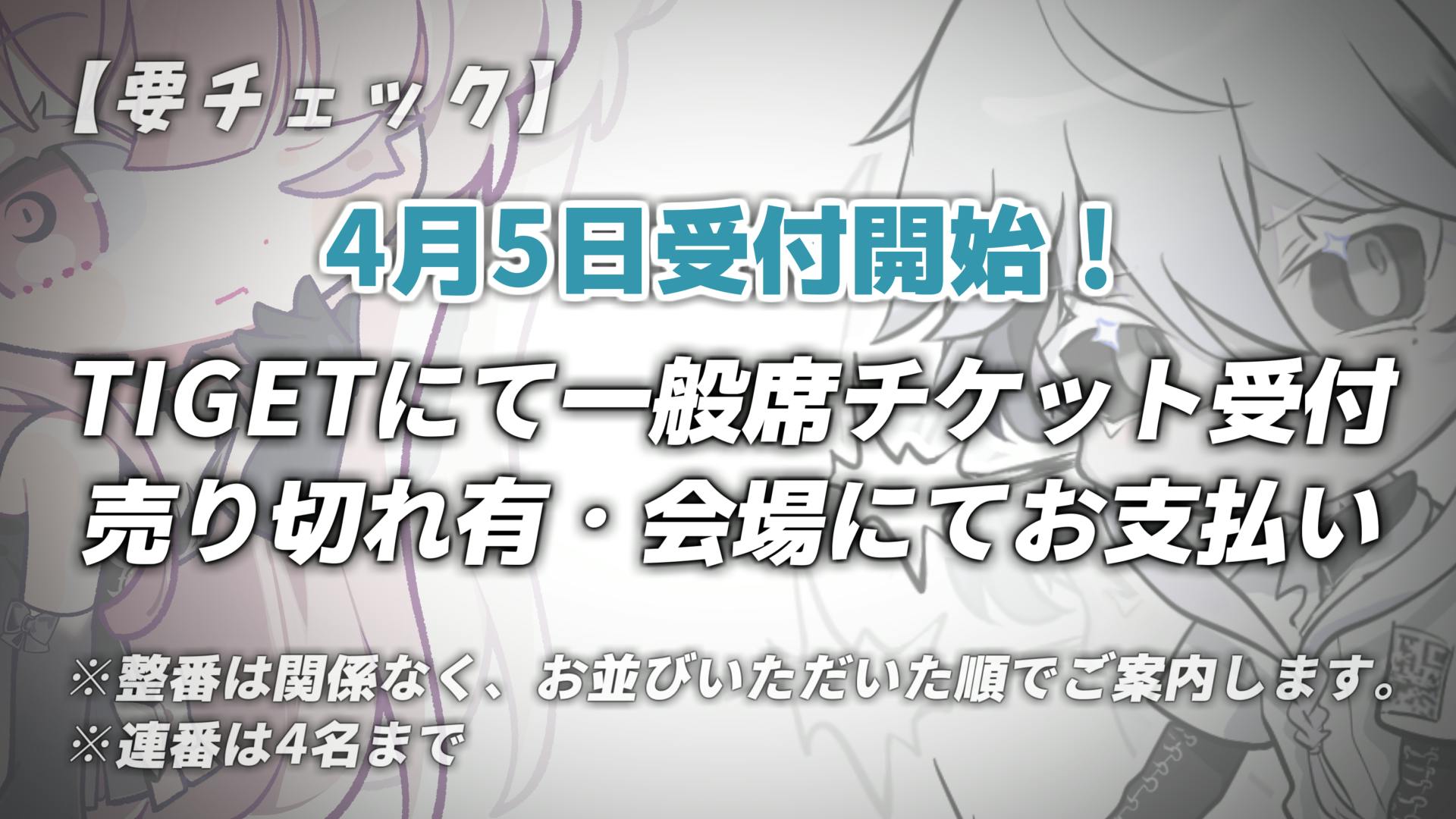 2024/04/02 22:03【一般席受付について】TIGETにて一般席チケット受付中!受付期間:2024.04.05 20:00 ~ 2024.04.25 20:00 <詳細,受付先>https://tiget.net/events/311201 ・売り切れ有・会場にてお支払い・連番は4名までとさせていただきます。・一般席の整番は関係なく、16:30からお並び始めた順にお会計→ご入場となります。・ドリンク交換は公演前でも公演後でも可能ですが、ドリンク交換所を通過され一度奥に入られますと公演終了までドリンク交換が出来ませんのでご注意ください。以上、ご協力の程よろしくお願いいたします。 もっと見る