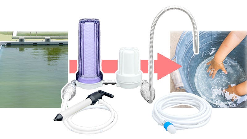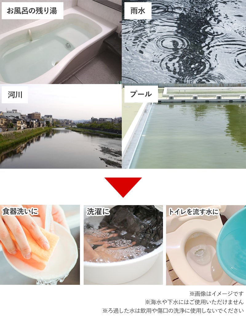 お風呂の残り湯や雨水をろ過することで、被災後の片付けや体を洗う水をご自身で大量に確保することができます。