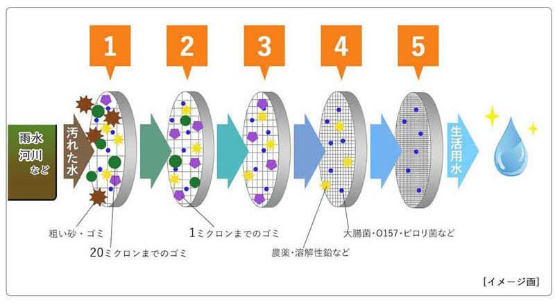 5種類もの高性能フィルターが、ごみや細かな不純物・一般細菌などを除去!