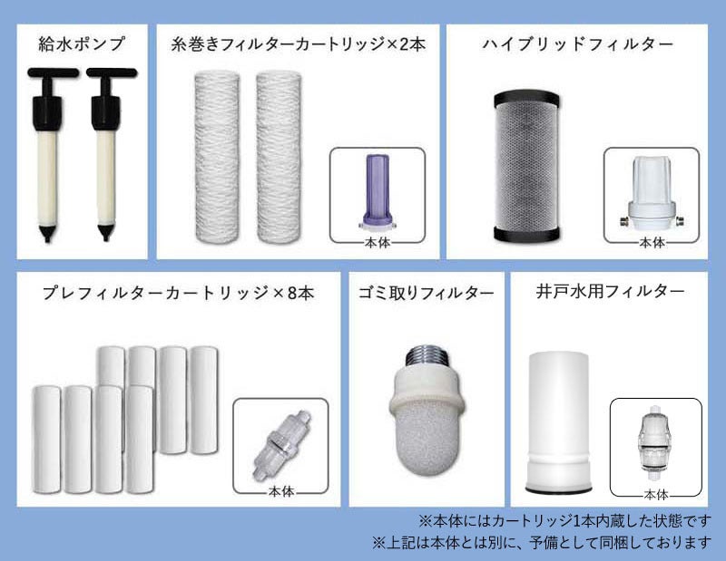 汚れが溜まりやすいフィルターやポンプには、予備カートリッジも同梱されており、必要な時に必要な水をたっぷりお使いいただけます。
