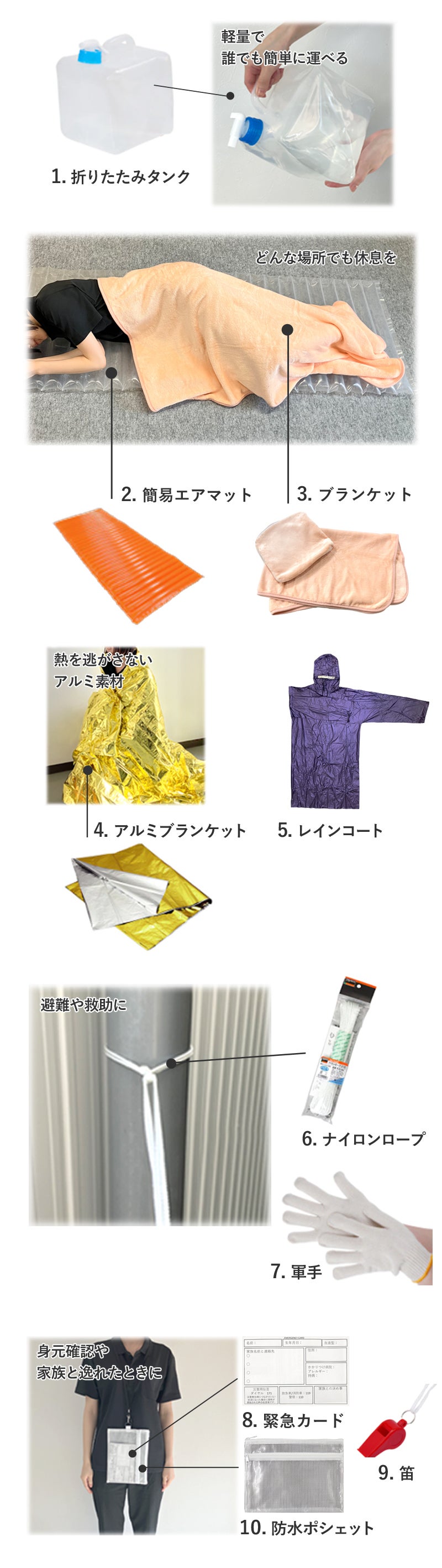 「助ける・助かる・守る」を合言葉に、実用性を重視した非常時用アイテムを詰めました。