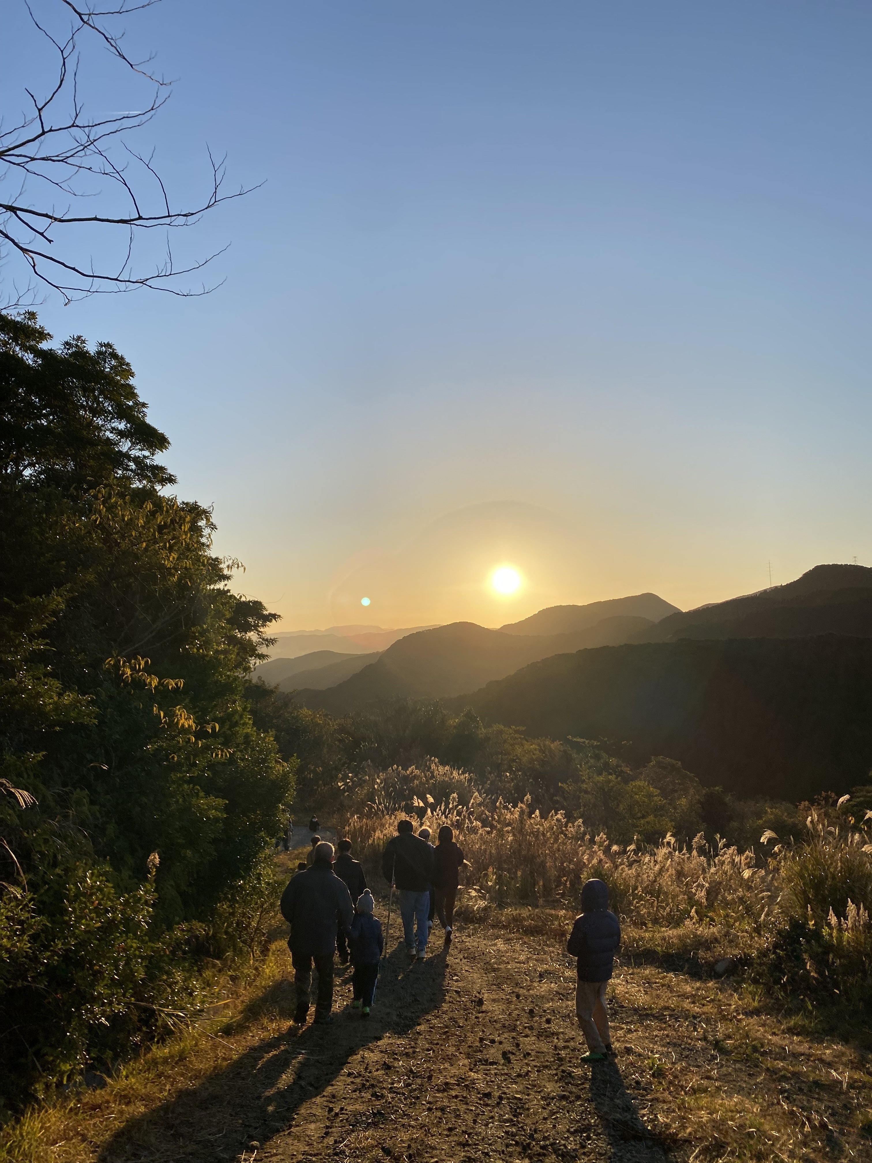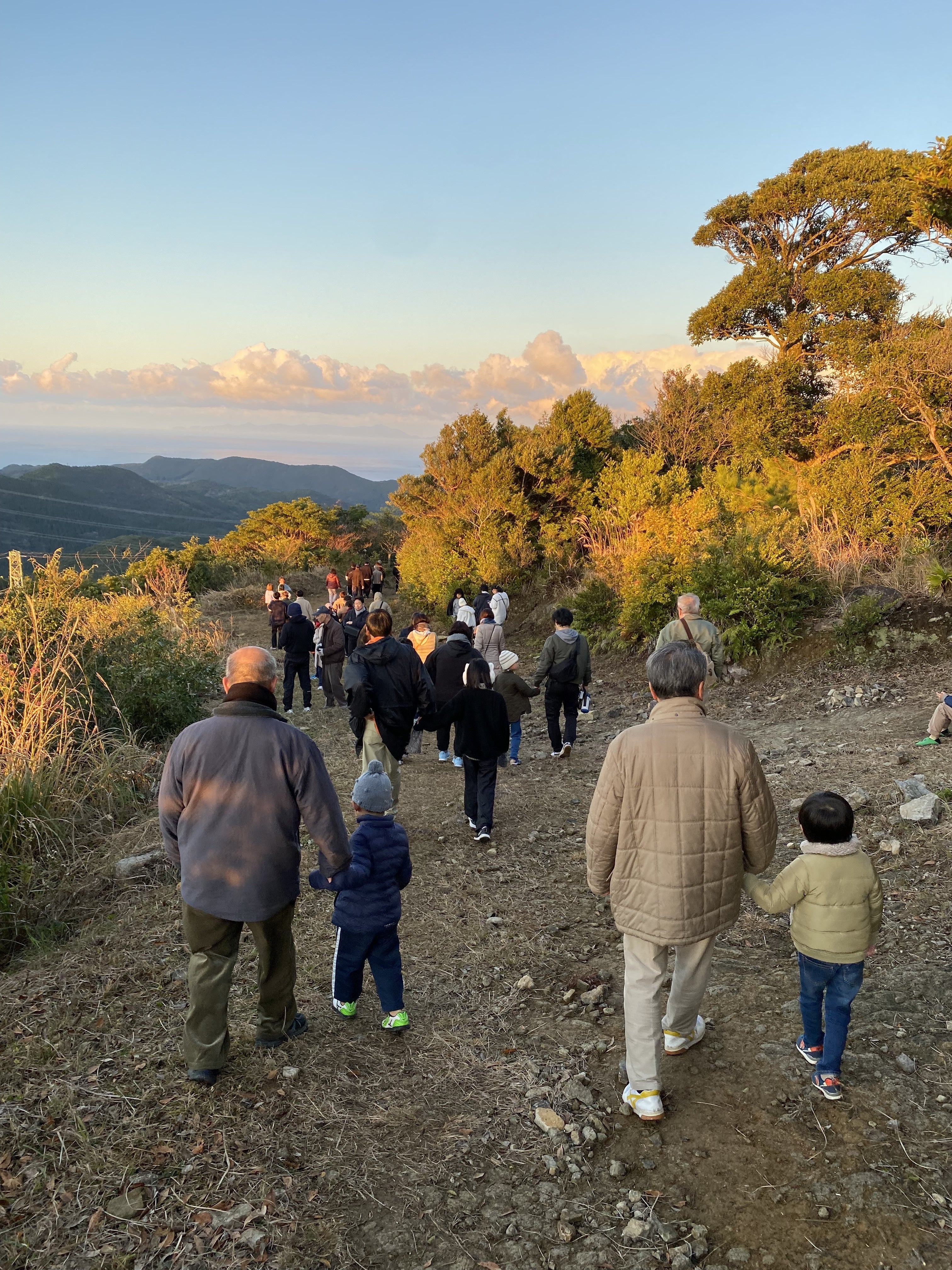 山頂から初日の出を見て下山する様子(砂利道、手すりなし)