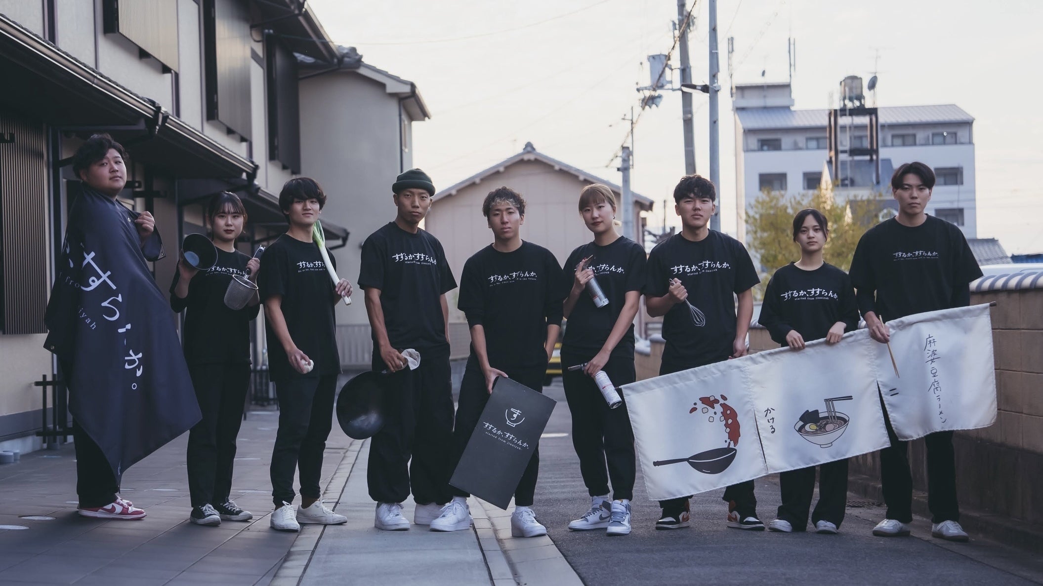 コロナの影響で、充実した大学生活を送れなくなり「人生おもろない。」と嘆いていた代表の西が、「このまま人生を終えるのは嫌だ。」と思い立ち、突然、当時同じサークルで麻婆豆腐が得意料理だった友達(料理長の奥野)を誘い、始めた店が、今の「すするか、すすらんか。」です。麻婆豆腐だけでは店として成り立たないと思い、当時よく食べていた”ラーメン”と掛け合わせて、麻婆豆腐ラーメン専門店【すするか、すすらんか。(旧名:jinniyah/奈KAMA)】を開業。もっと麻婆豆腐の店としてのレベルを上げるために、毎日何十時間も中華鍋をふるい、味がわからなくなるまで修行を重ねました。最初は、大学もバイトも遊びもなくて暇だったからノリで始めただけ。自分達がバイトで貯めたお金を全て使い、DIYをして店をオープンしたのはいいものの、「お客さんが来ない」現実を突きつけられました。