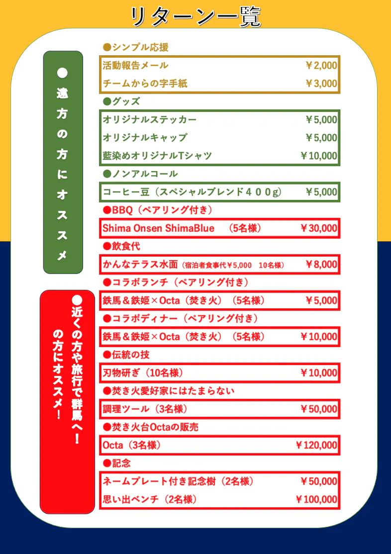 ●リターンについて、地域の協業者とのマッチングを通じて、リターン品の選定を始めました。以下品々を検討しています。